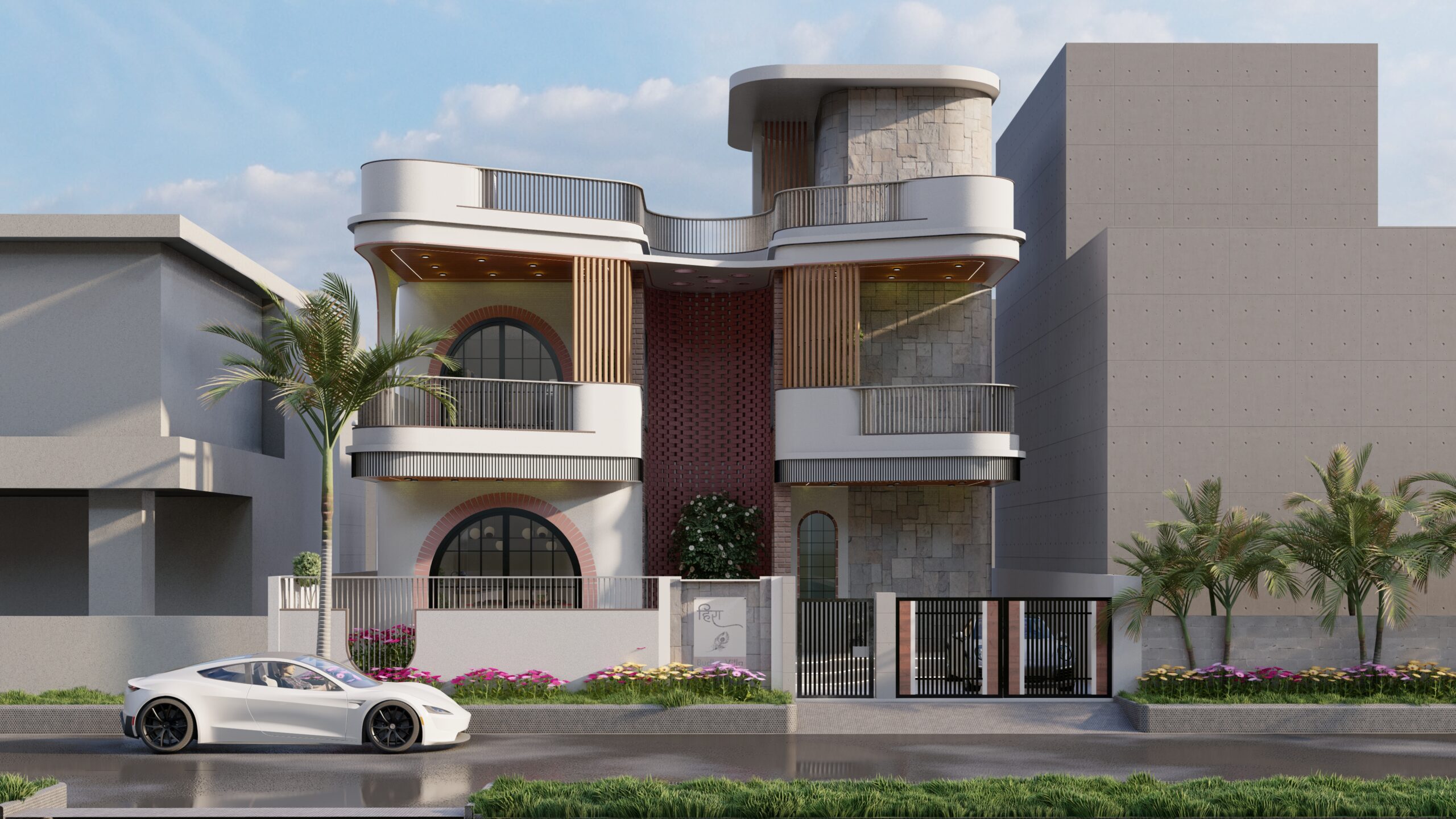 This residential design showcases a harmonious blend of contemporary and traditional architectural elements. The curved balconies and arched windows provide a soft, fluid aesthetic, contrasting with the angularity of modernist forms. The façade incorporates diverse materials, including exposed brick, natural stone, concrete, and wood accents, creating a rich textural interplay.