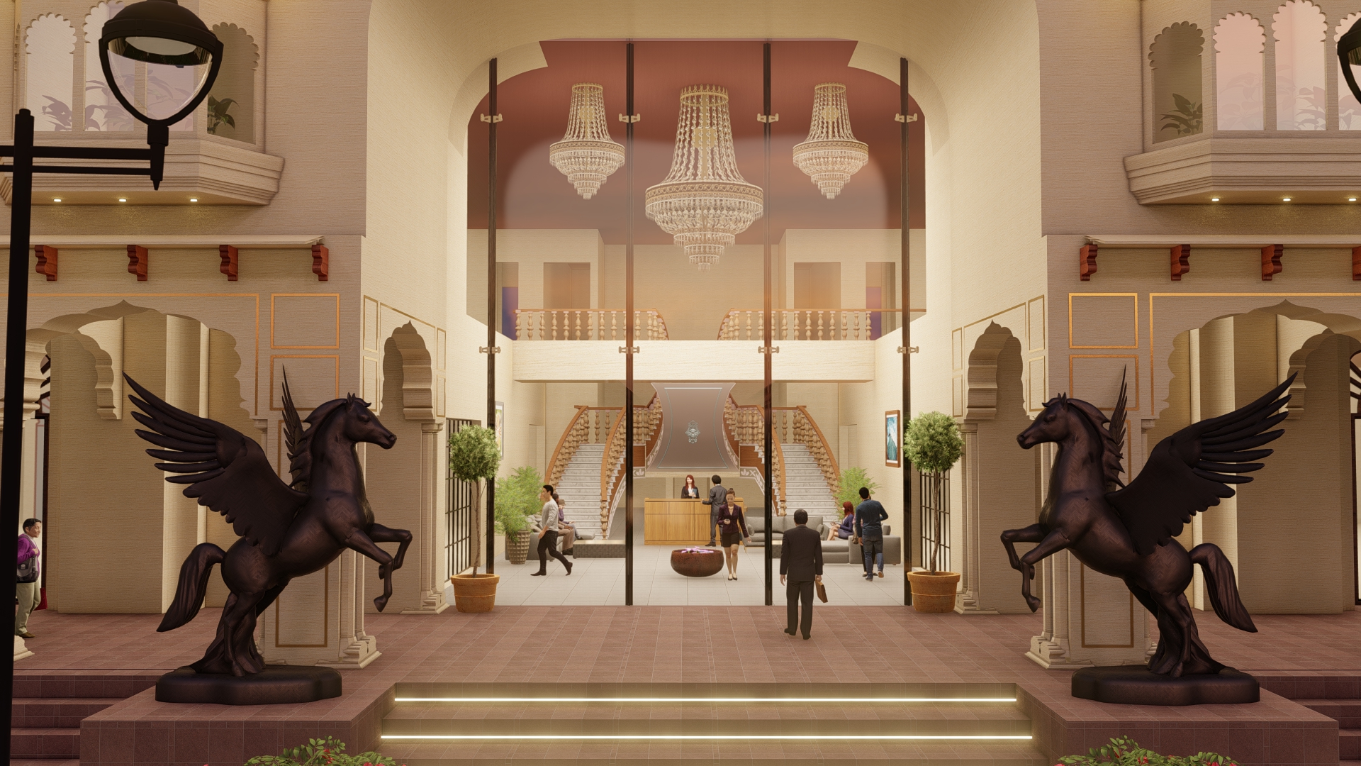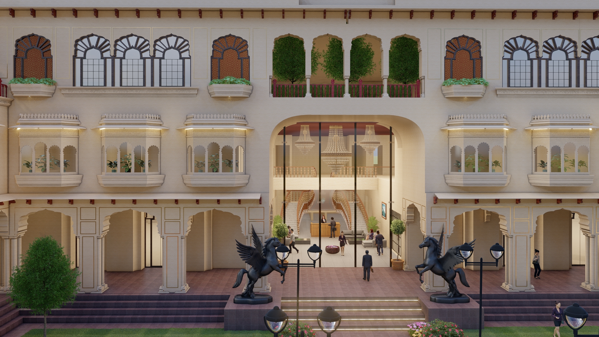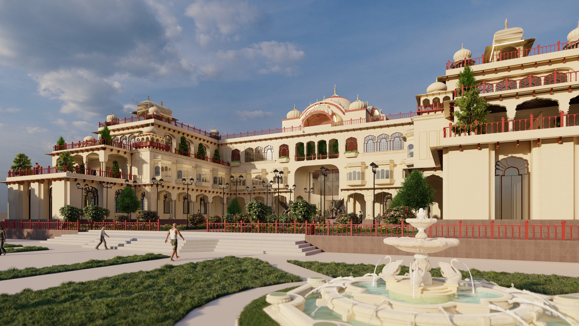 The warm-toned sandstone cladding echoes traditional Indian materials, while the central arched gateway and multi-tiered terraces enhance the visual hierarchy. Red railings and jaali patterns offer rhythmic contrast, and the landscaping with fountains and symmetrical lawns emphasizes balance and harmony. Inspired by Vastu principles and Mughal-Rajput fusion design, this space is not just architecture—it is an experience of cultural legacy reimagined for the modern era.