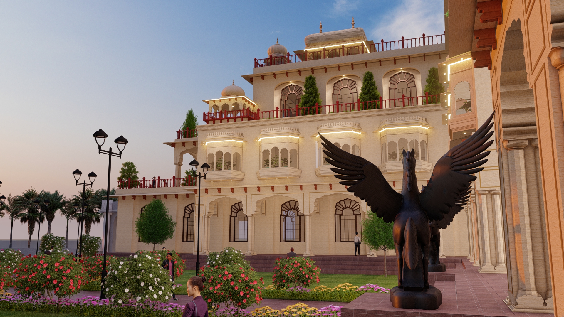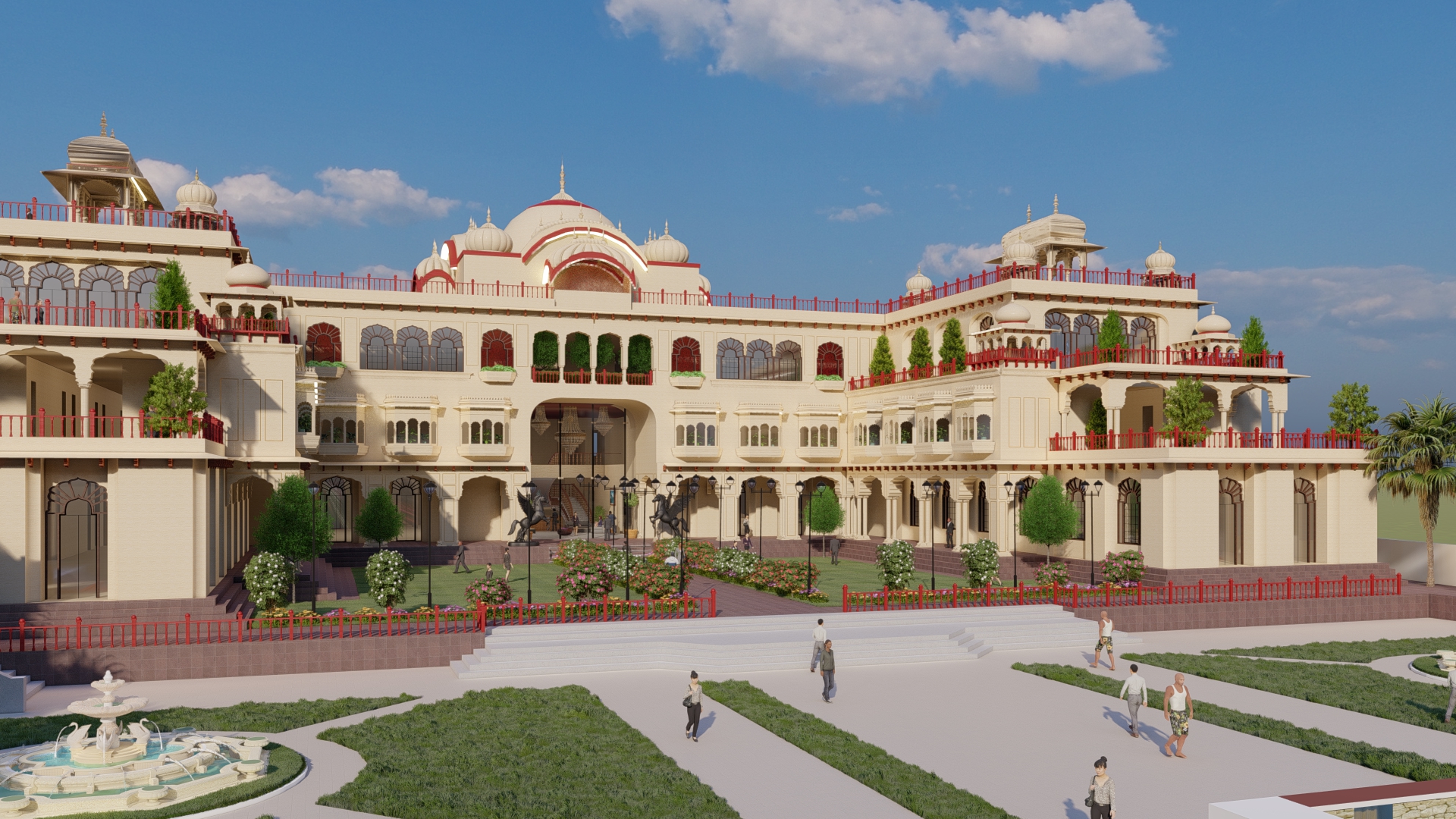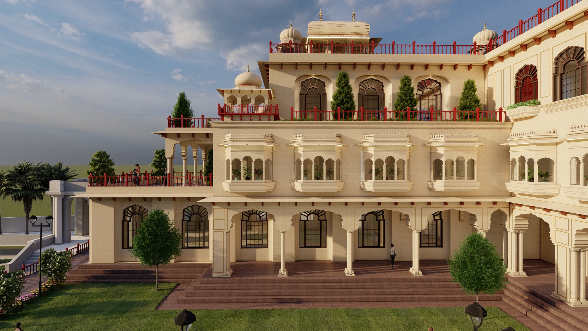 This architectural design is a majestic blend of Rajasthani heritage and classical Indian palace architecture. I conceptualized this structure with the intent to evoke royal grandeur while maintaining spatial functionality for contemporary use. The use of domes, chhatris, jharokhas, and intricately arched windows pays homage to Rajputana architecture.