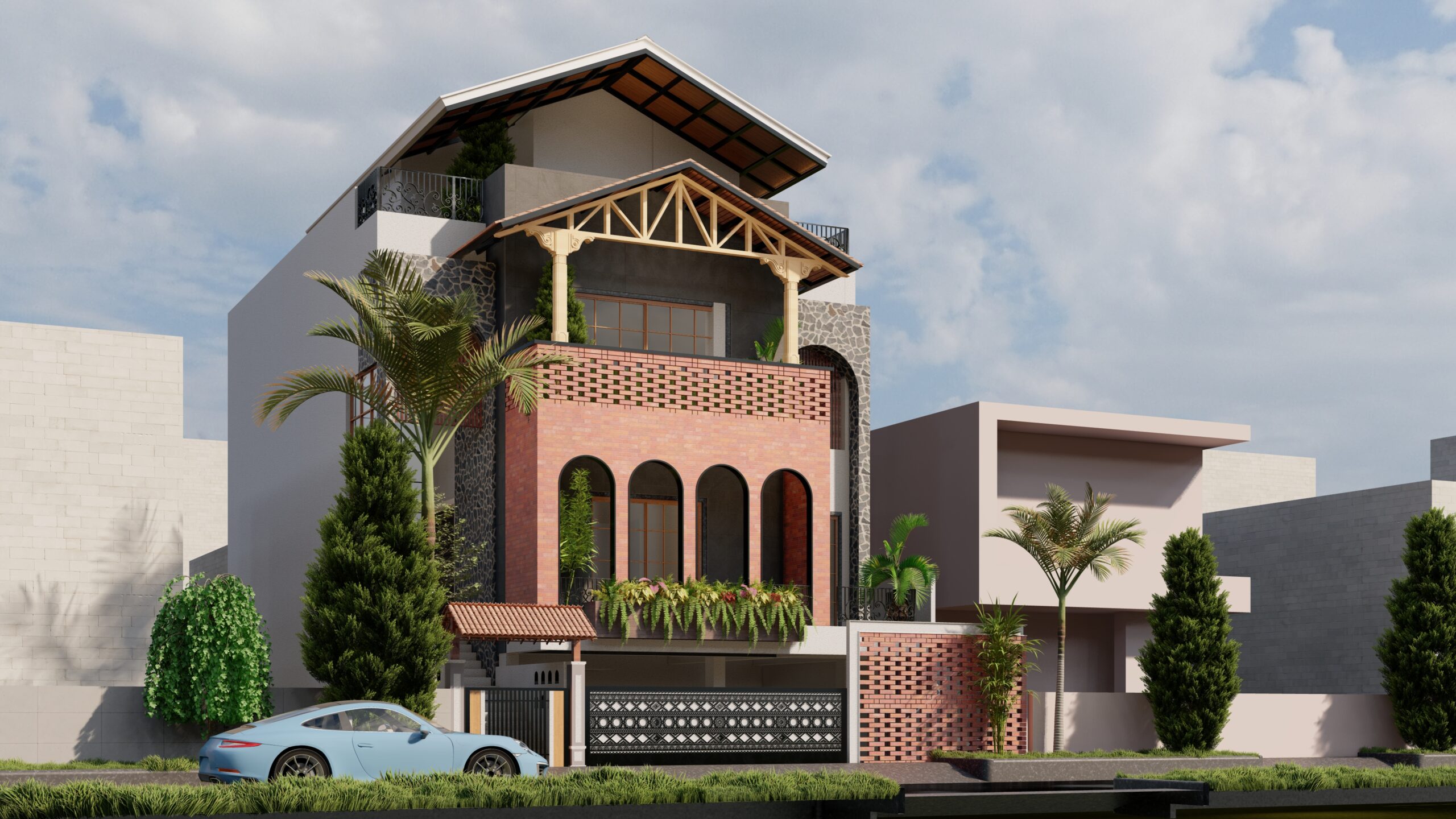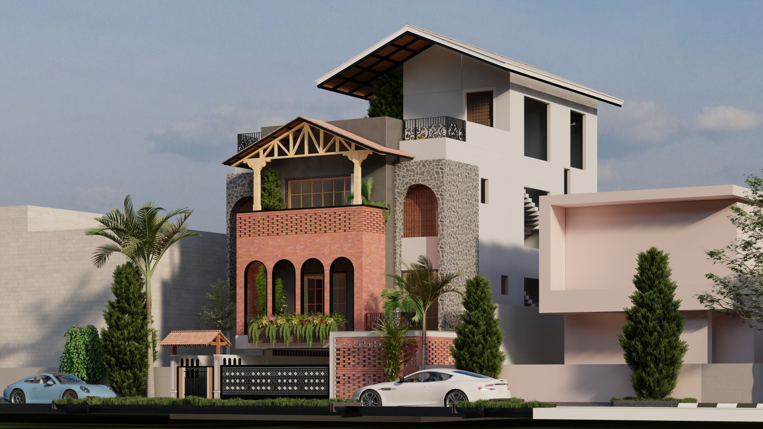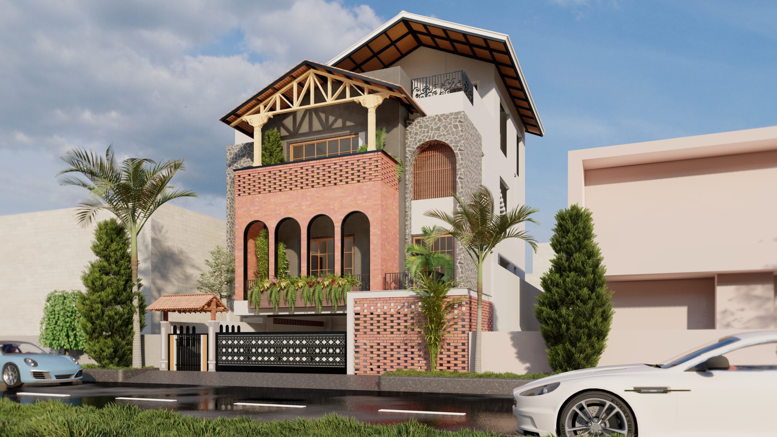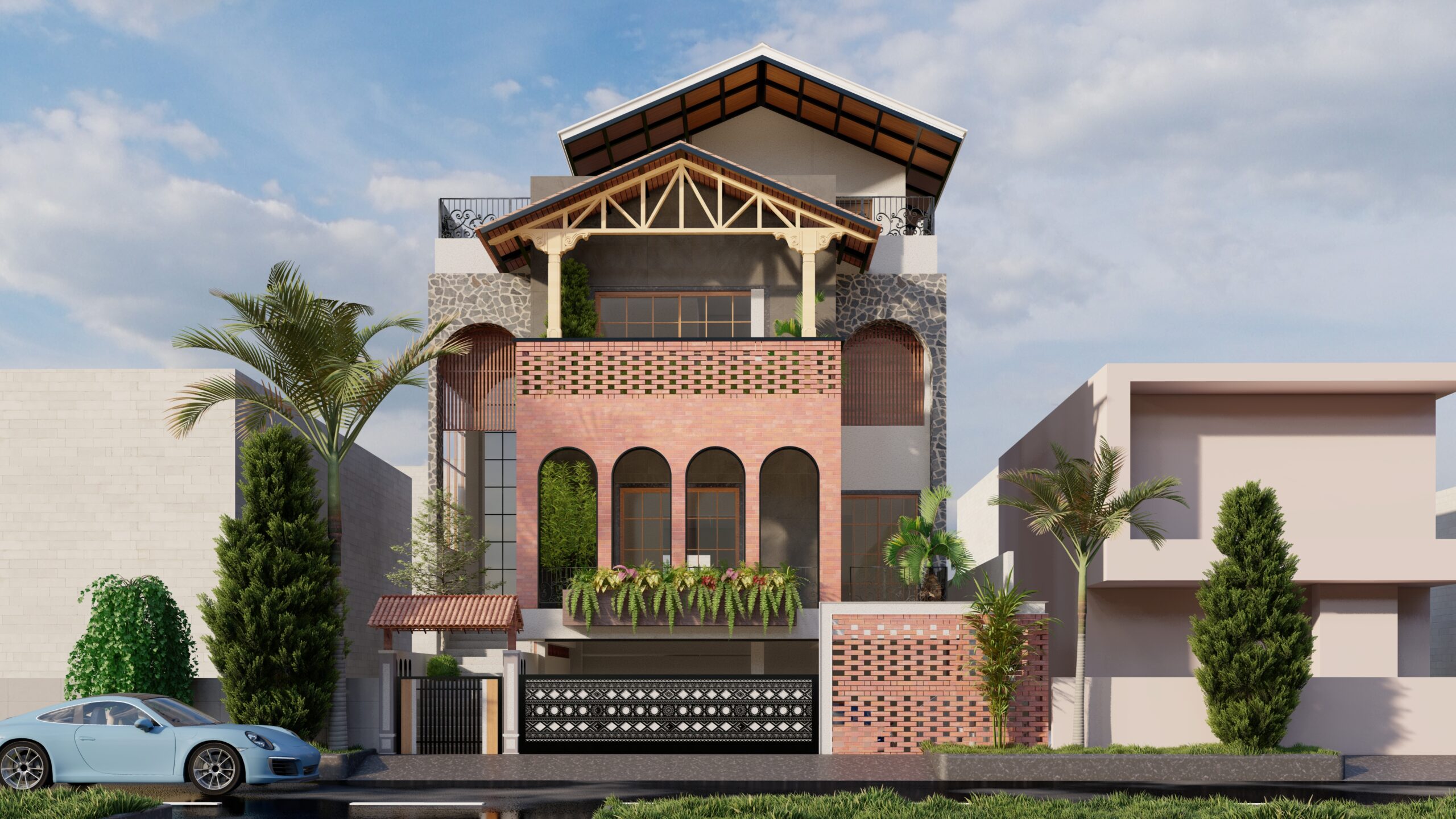 This building exemplifies a rustic yet modern architectural style with a fusion of vernacular and contemporary elements. The design features exposed brickwork as a dominant material, highlighting earthy tones and a tactile texture. Complementing the brick, stone cladding enhances the rugged aesthetic, while wooden trusses and detailing add warmth and a sense of tradition.