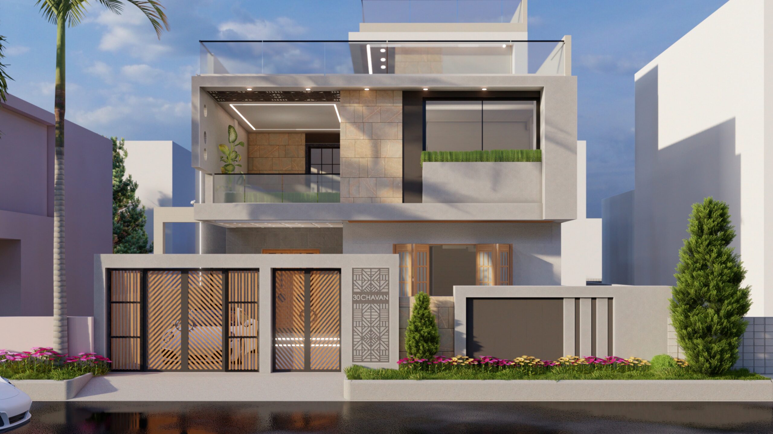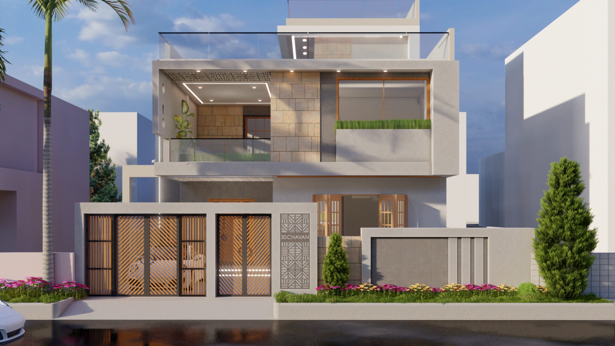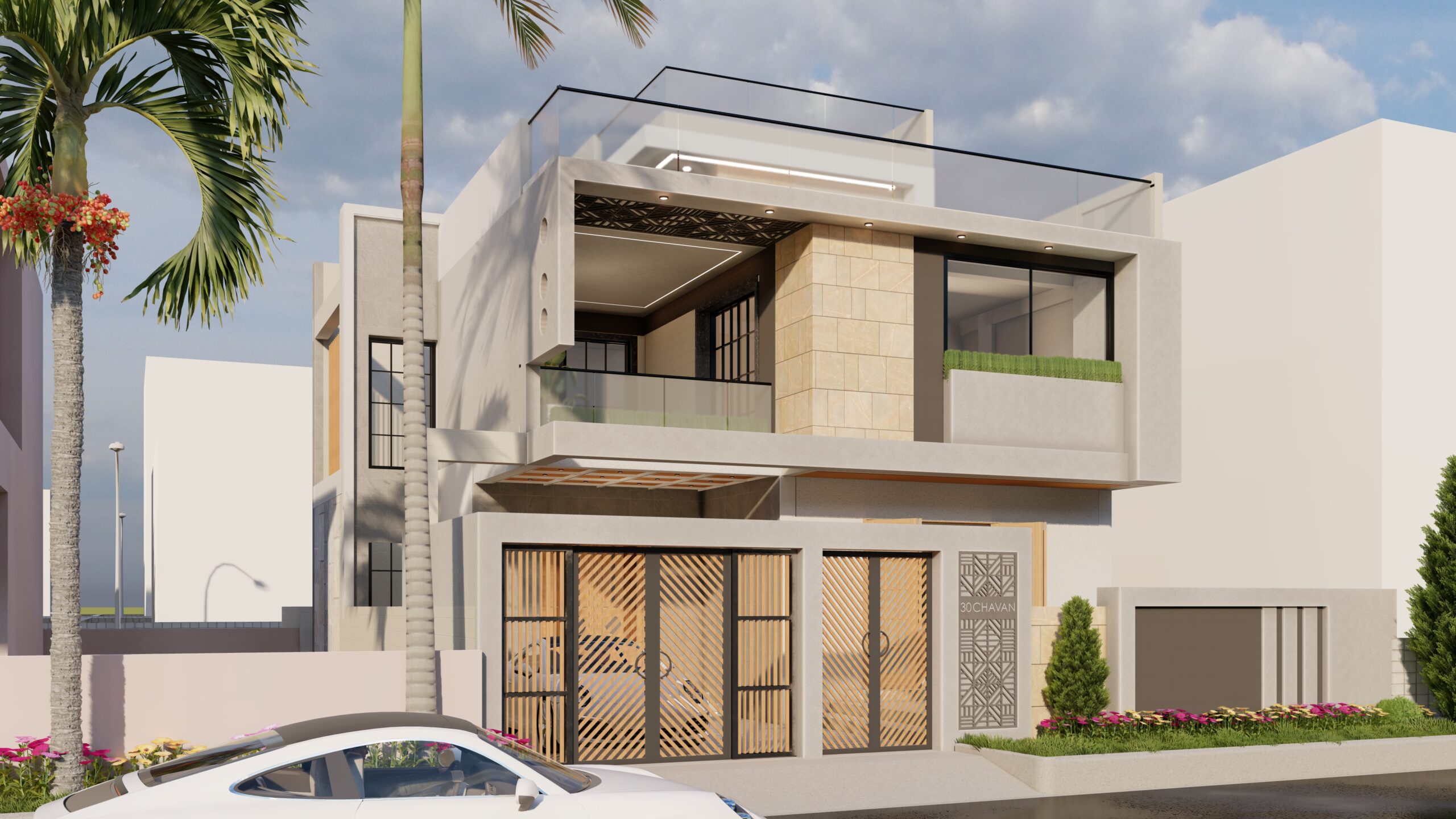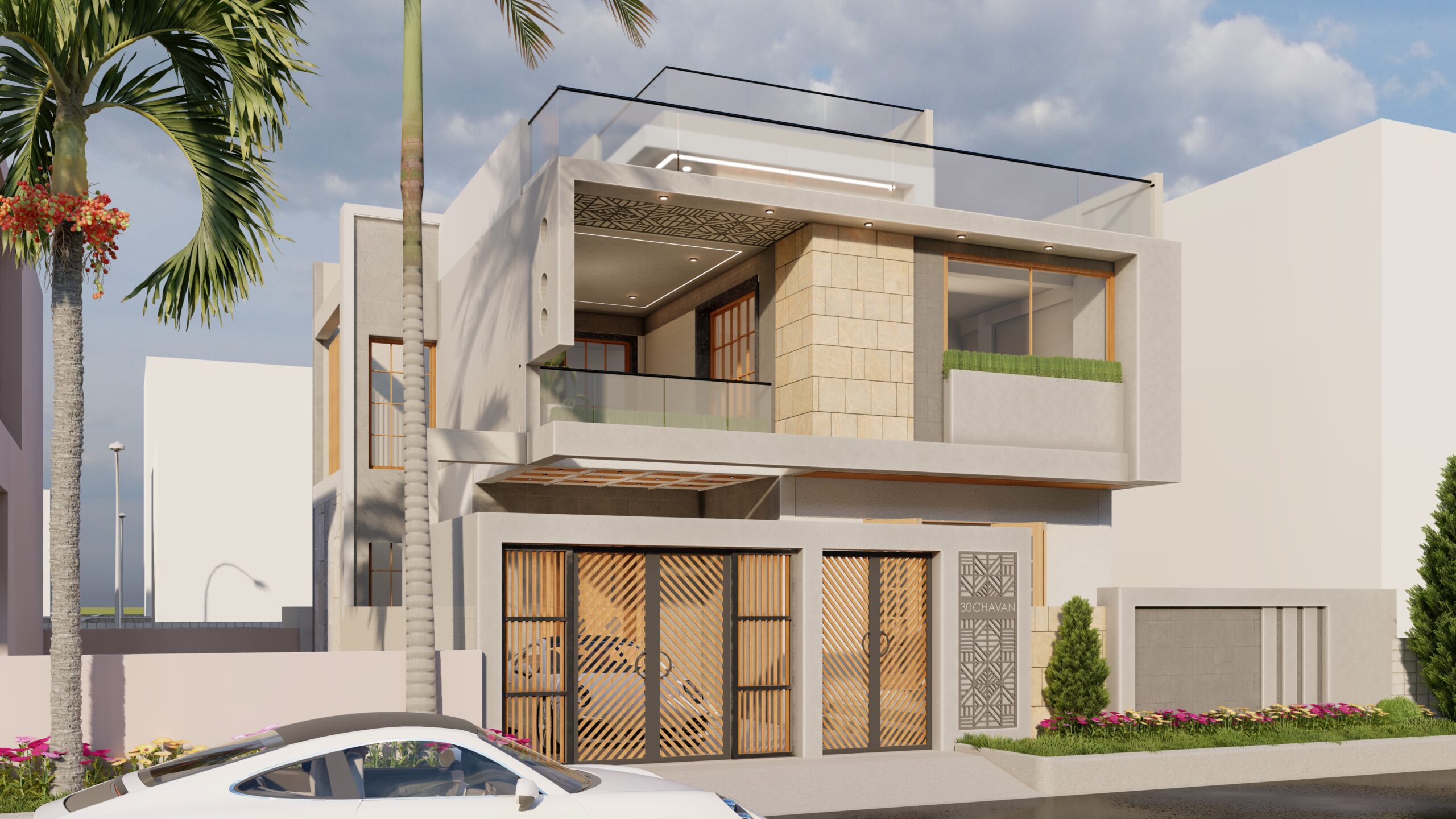 This modern residence features a minimalist architectural design with clean, geometric lines and an emphasis on simplicity and functionality. The façade showcases a combination of materials, including exposed concrete, glass, and natural stone cladding, creating a balanced interplay of textures. The large glass panels allow ample natural light to flood the interiors, ensuring visual transparency and a connection with the outdoors.