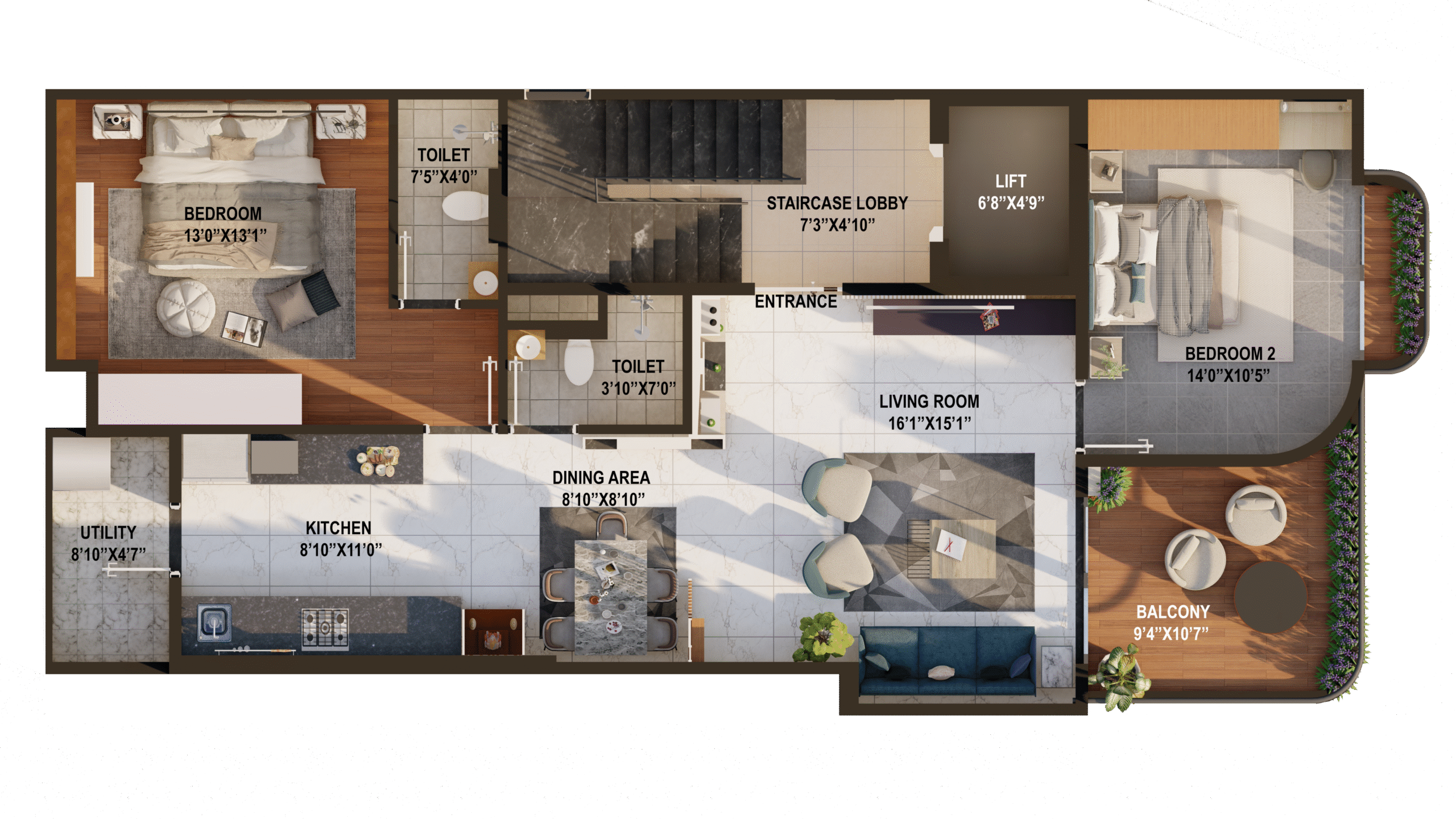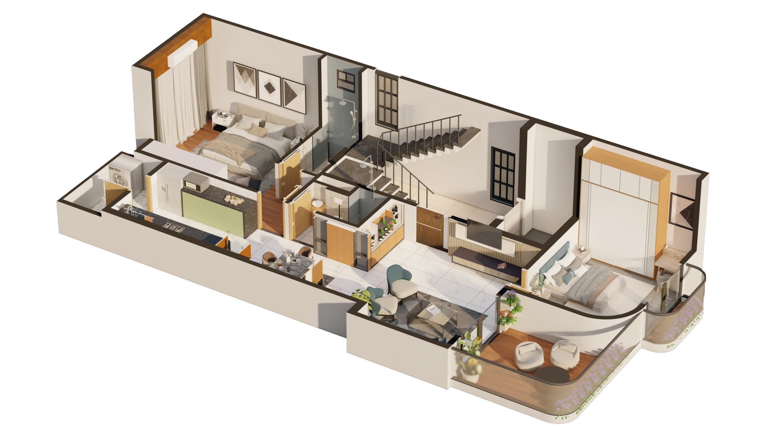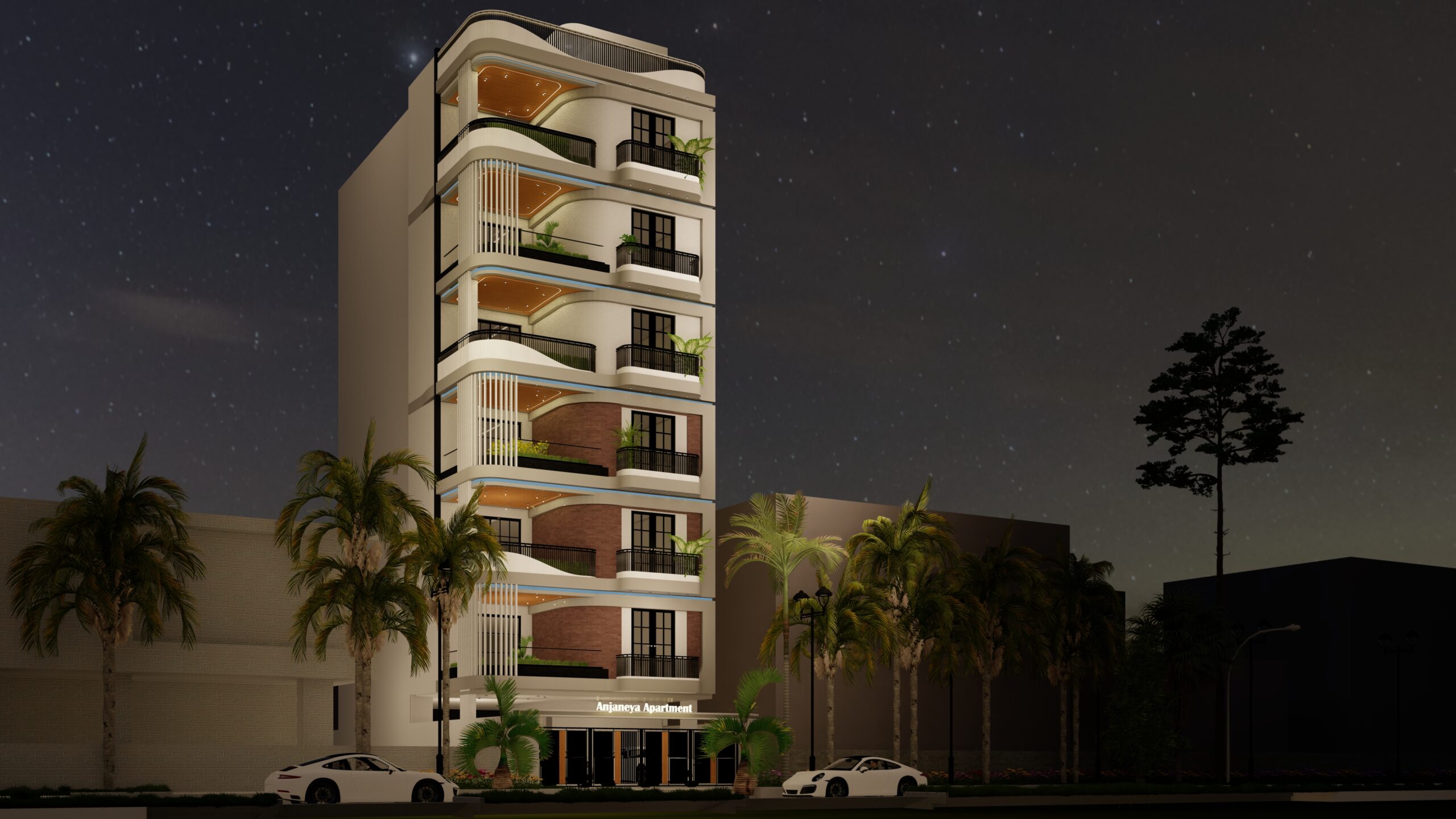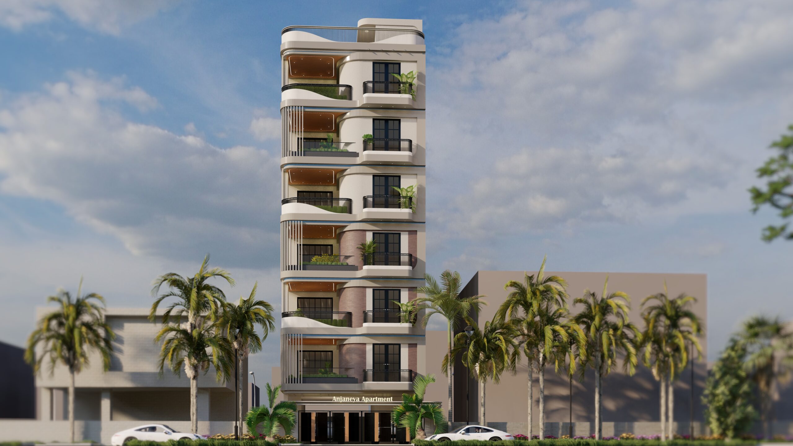 - This project, Anjaneya Apartment, is a blend of organic form and contemporary elegance. I designed the façade with fluid, curvilinear balconies that soften the vertical mass and promote dynamic shadow play. The material palette includes cream-toned textured plaster, vertical fins, glass railings, and warm wooden ceiling panels for semi-open terraces. Inspired by biophilic design principles, I integrated green pockets on every floor to enhance the connection with nature and improve resident well-being. The design adheres to modernist principles with minimal ornamentation, functional forms, and optimized ventilation and daylighting. It reflects my vision of merging aesthetics with purposeful living in a compact urban context.