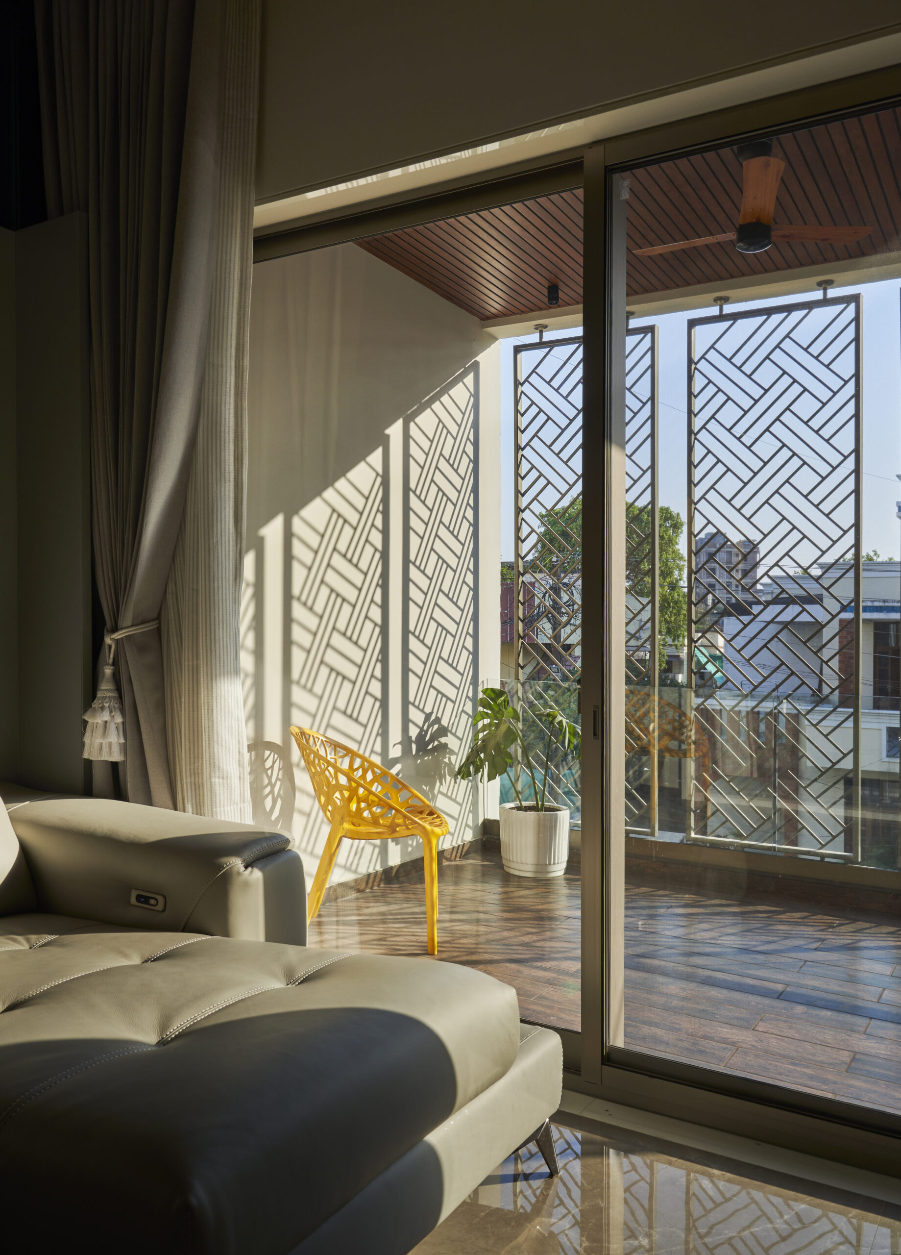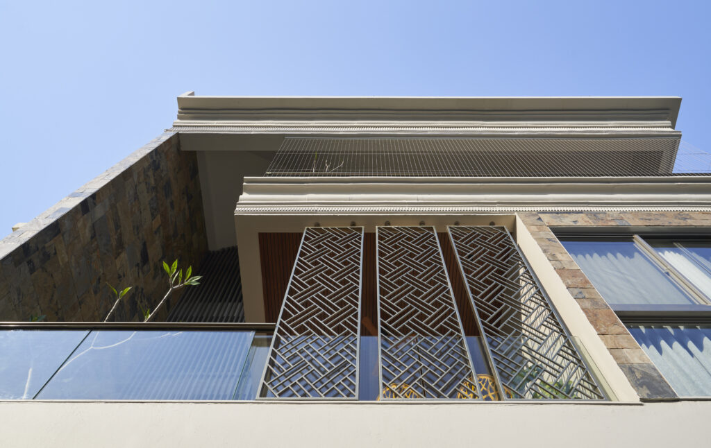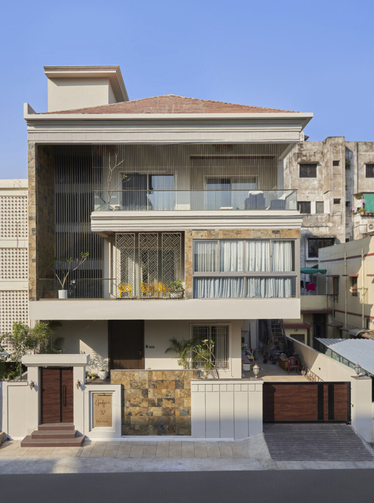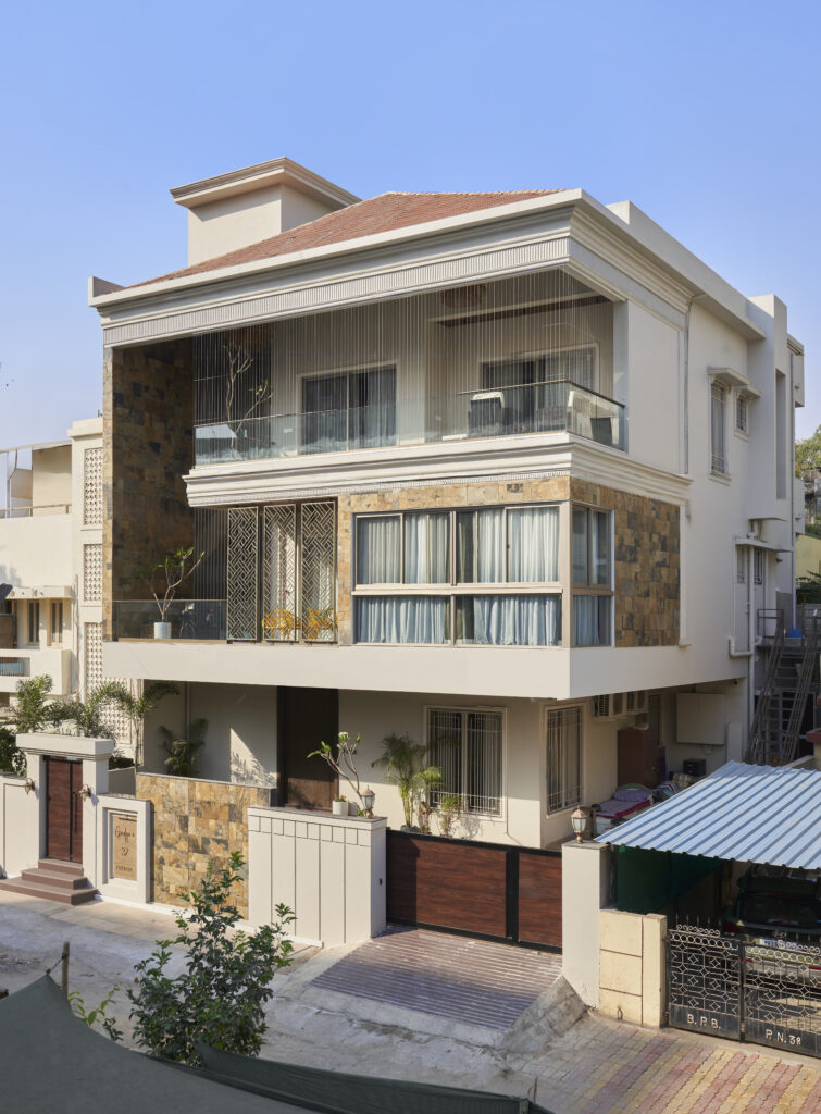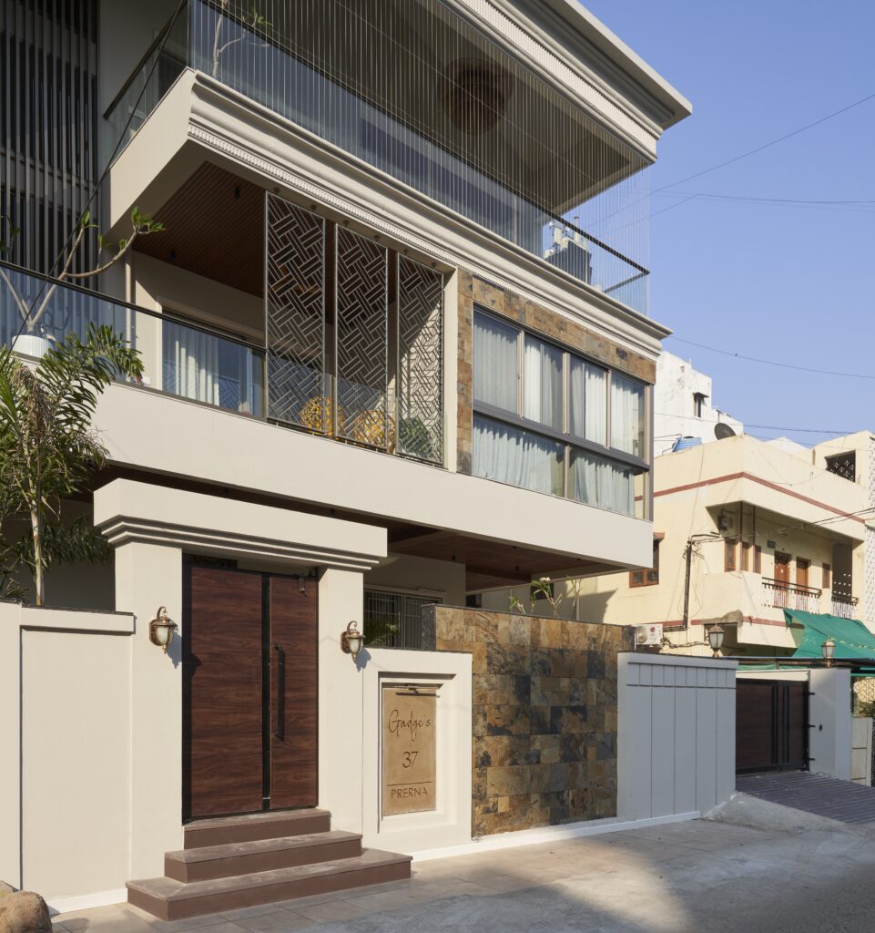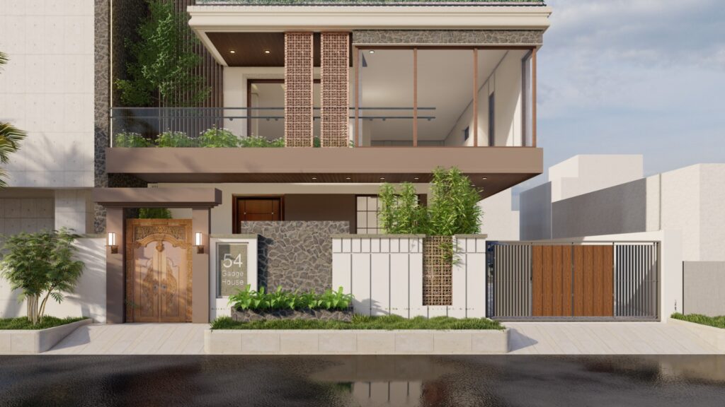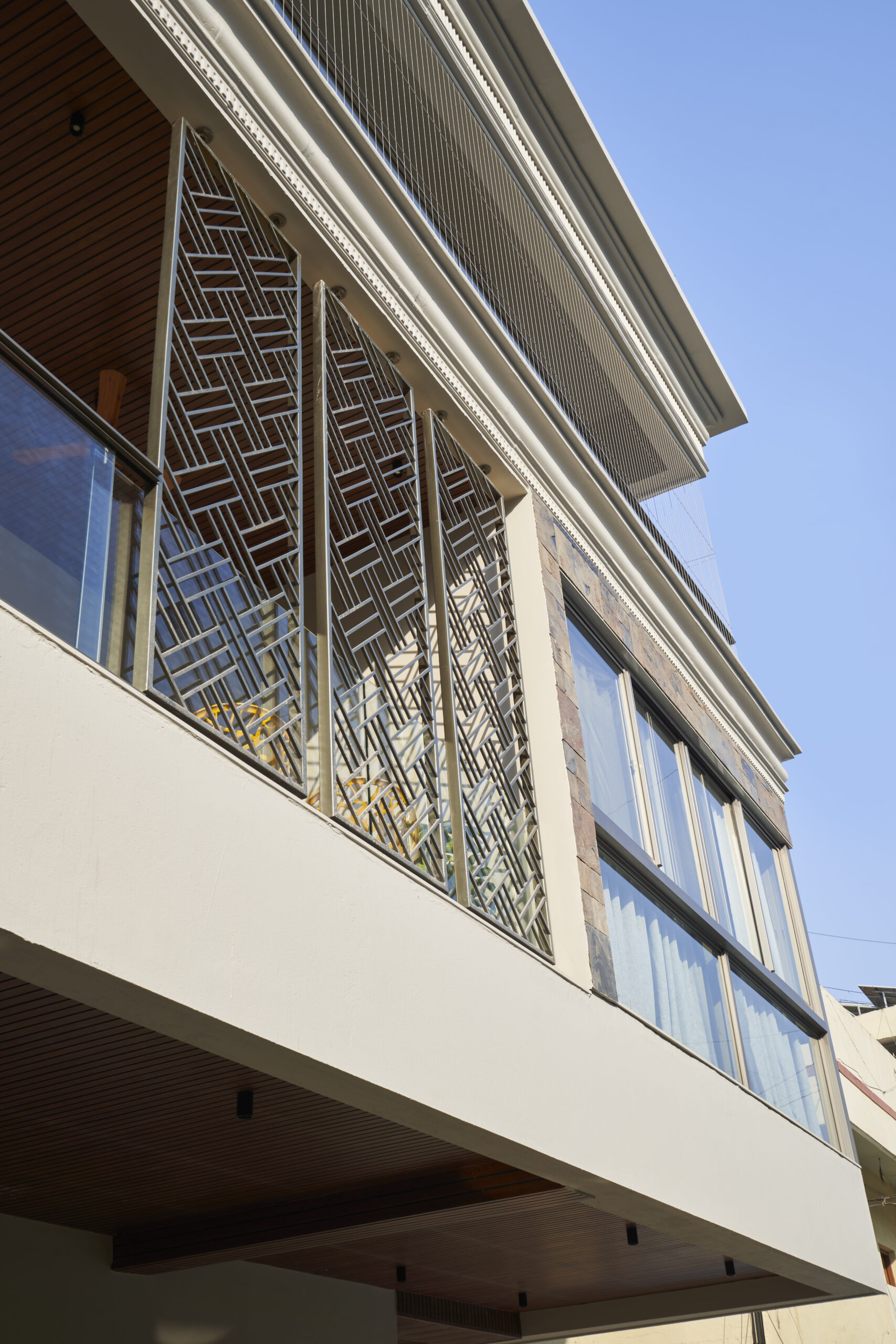 I designed this building with a focus on blending modern minimalism with contextual relevance. The façade features exposed concrete and locally-sourced sandstone, offering both aesthetic character and thermal comfort. Vertical fins and deep overhangs, inspired by Le Corbusier’s brise-soleil, optimize light and shade. Influenced by Bauhaus and Vastu Shastra, the spatial planning ensures balance, function, and natural flow. Double-height spaces and open transitions enhance volume and light. Natural materials like teakwood and metal louvers add warmth and texture. Every element—from massing to materials—was curated to create a sustainable, timeless, and experience-driven architectural expression.