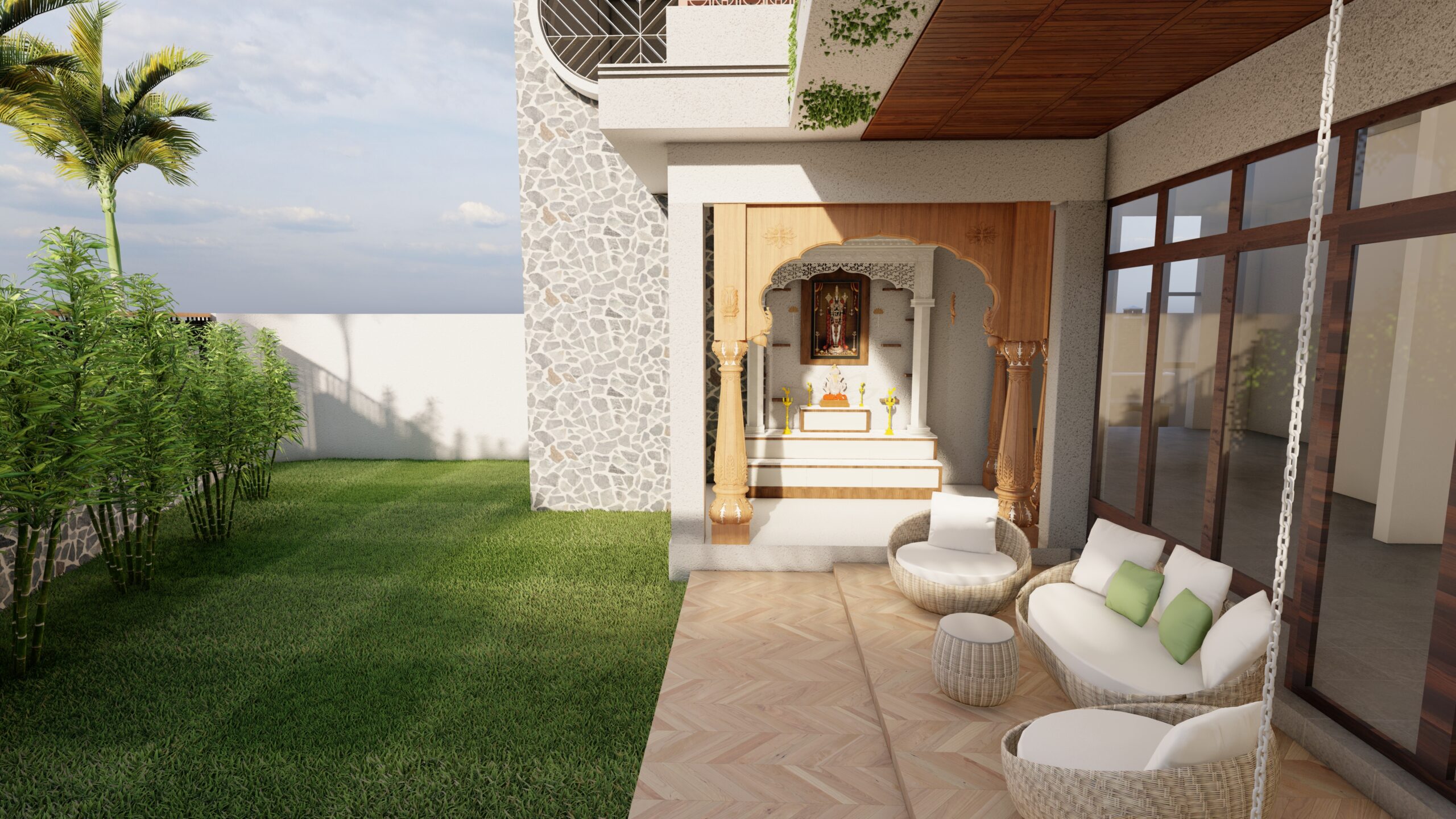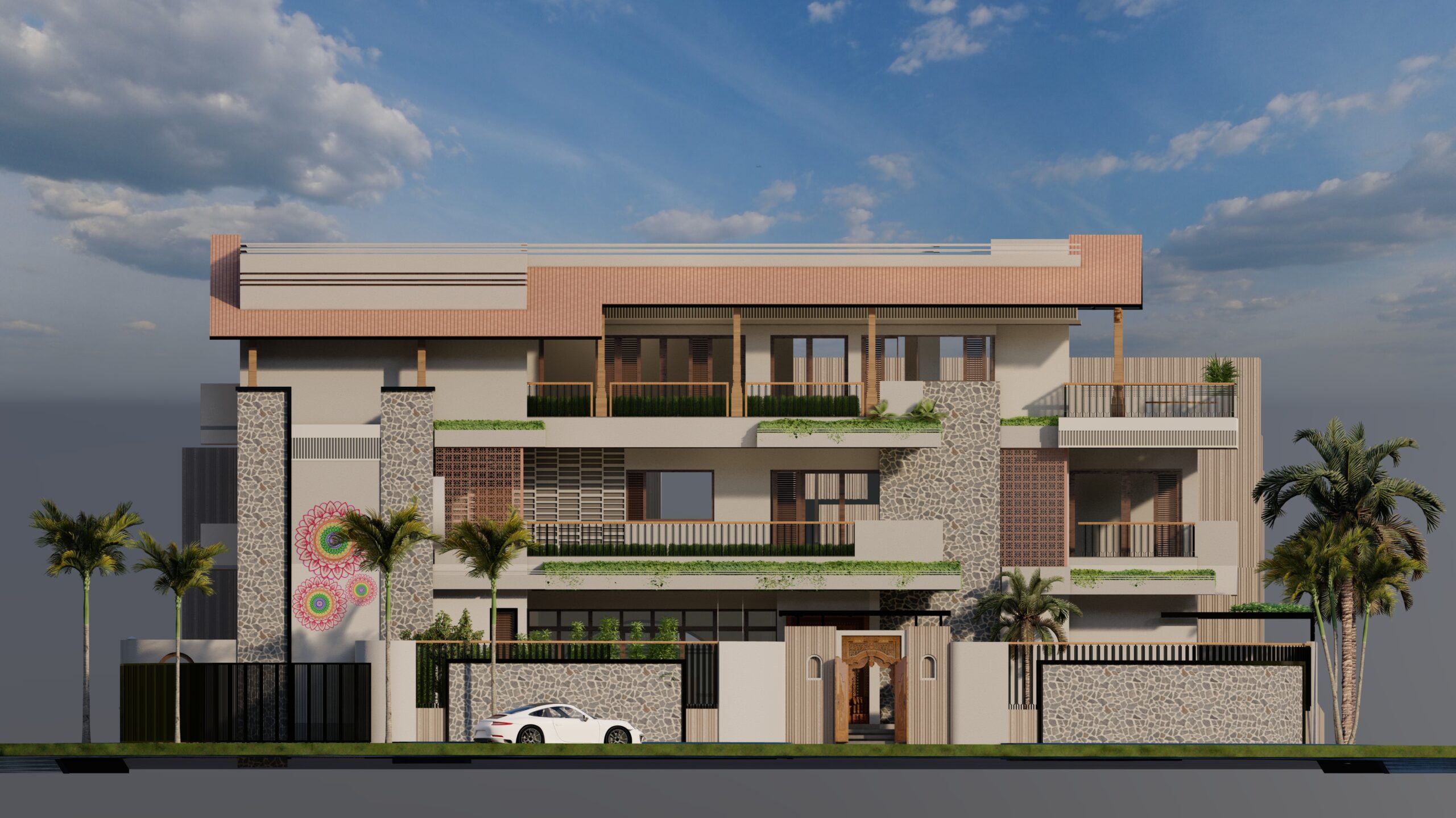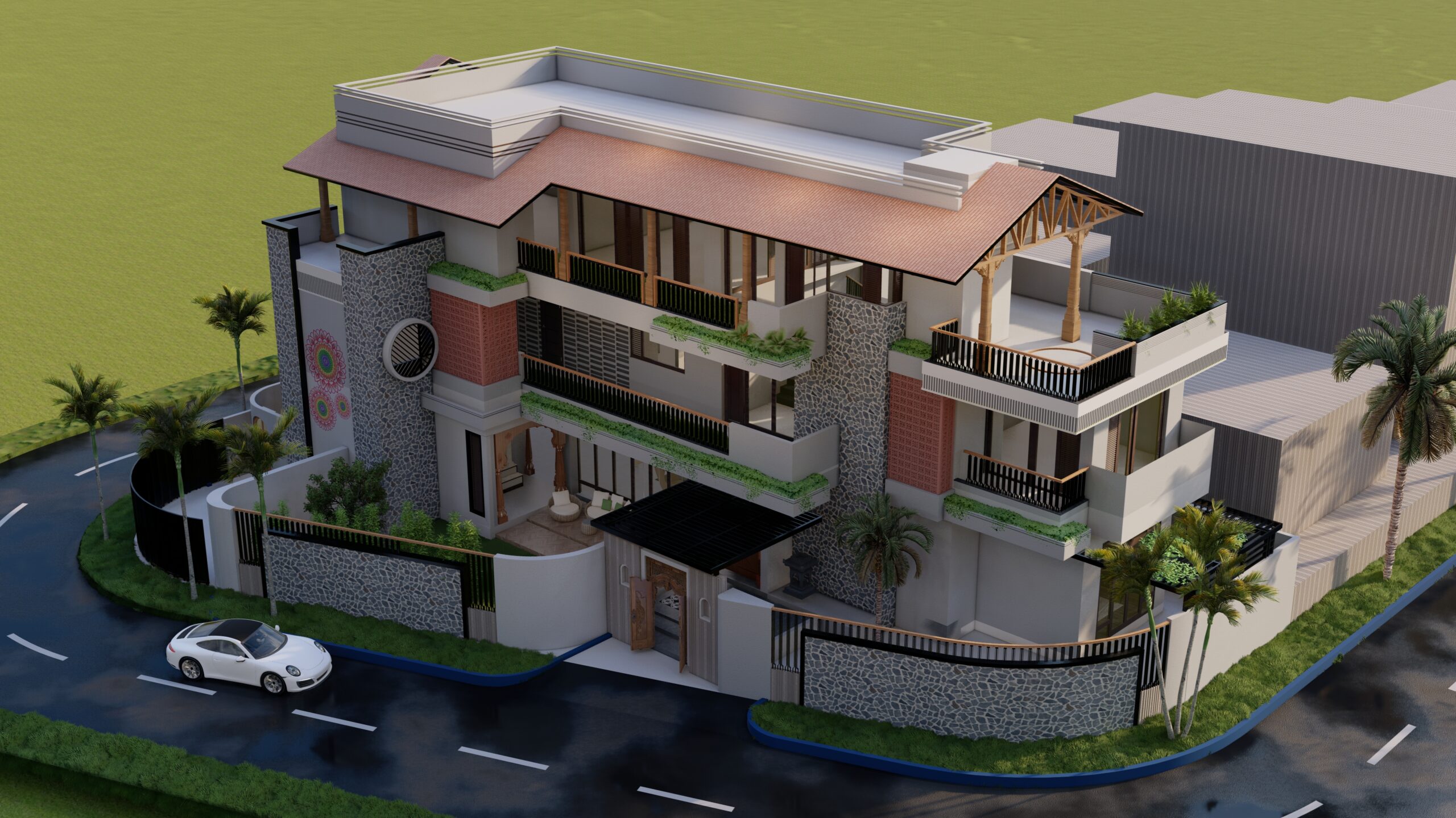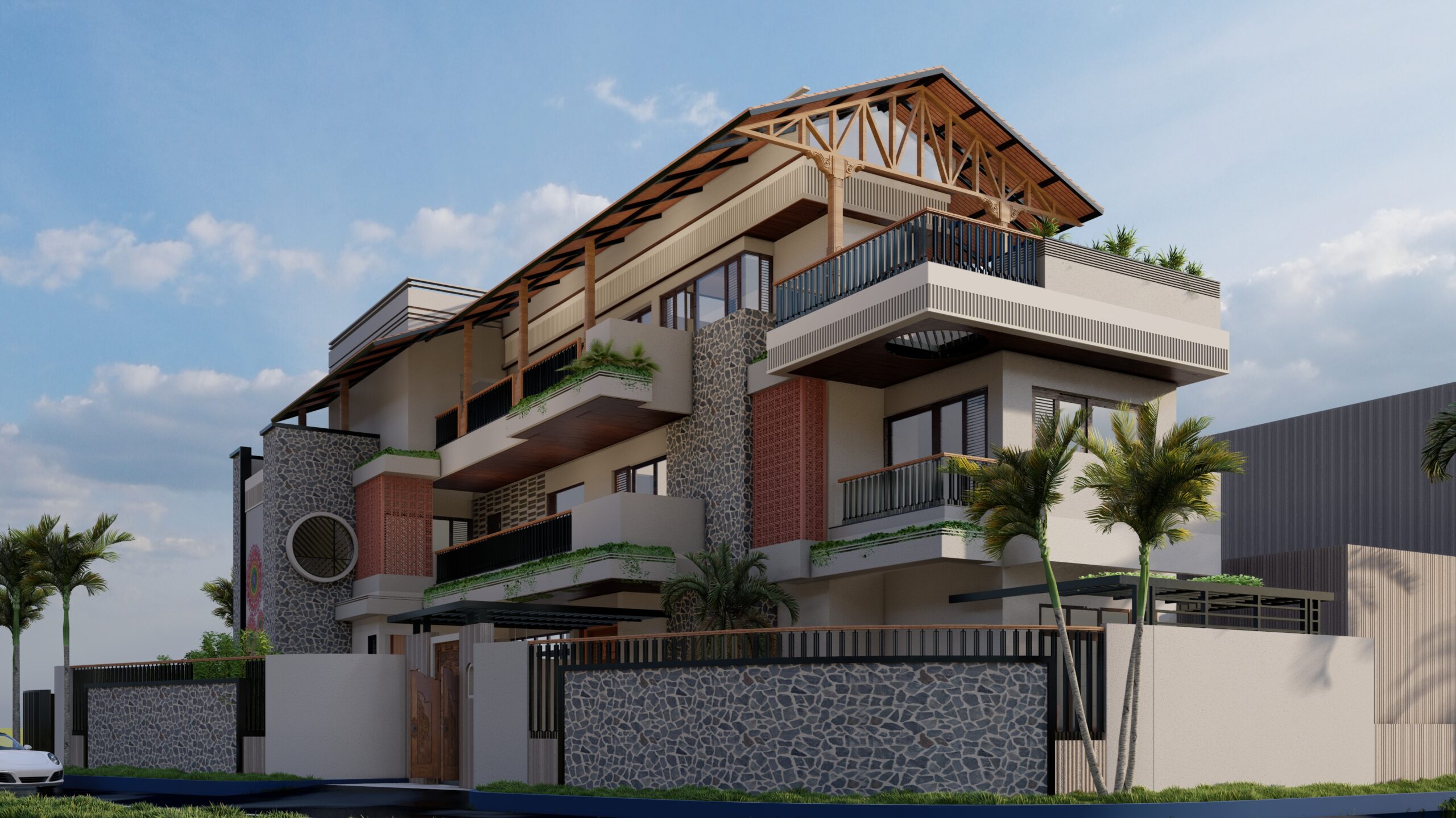 The design of this three-story modern villa showcases a harmonious blend of contemporary and traditional architectural elements. The structure employs a variety of materials, including stone cladding, exposed brickwork, wood accents, and glass, creating a dynamic yet cohesive aesthetic. The use of stone cladding adds a sense of robustness and connection to nature, while exposed brick offers texture and warmth. The design theory integrates elements of tropical architecture, emphasizing open layouts, extended balconies, and rooftop green spaces to promote natural ventilation and mitigate heat.