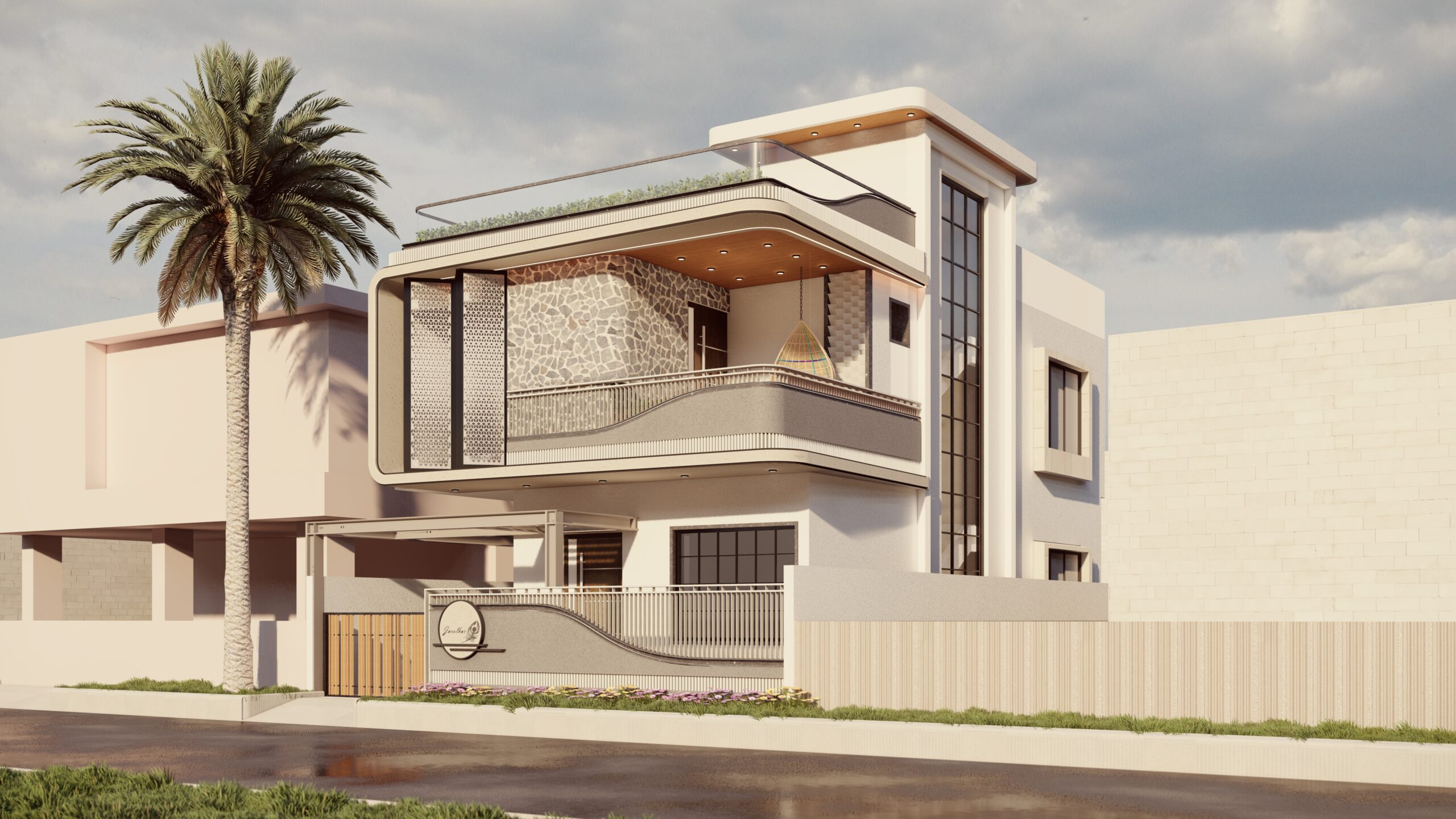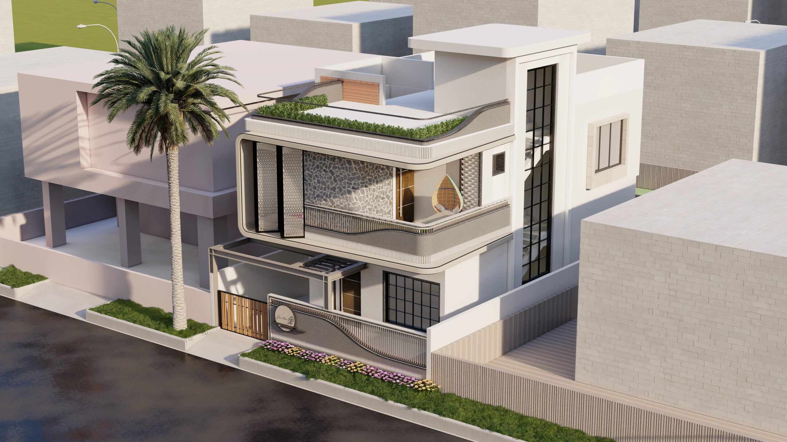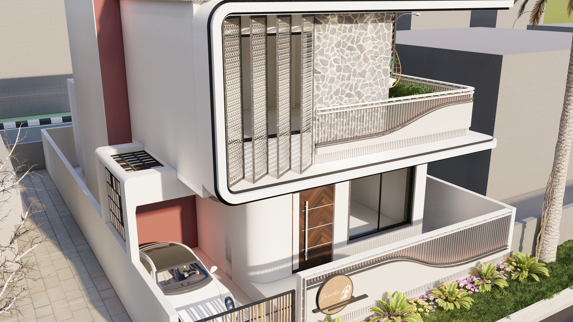 This modern two-story residence showcases a minimalist yet elegant design, blending functionality with aesthetic appeal. The building’s facade emphasizes clean lines and geometric forms, combining curves and rectangular elements to create a dynamic visual flow. A primary focus is the interplay of materials: stone cladding adds a natural, grounded texture, while perforated metal screens provide a contemporary touch, offering both privacy and ventilation