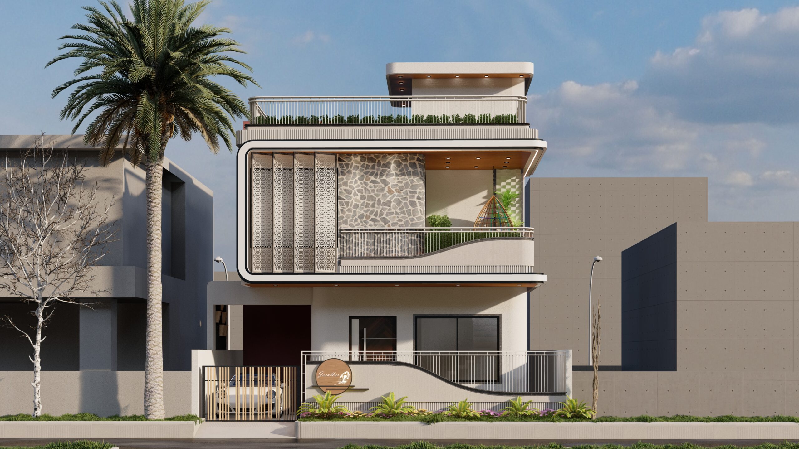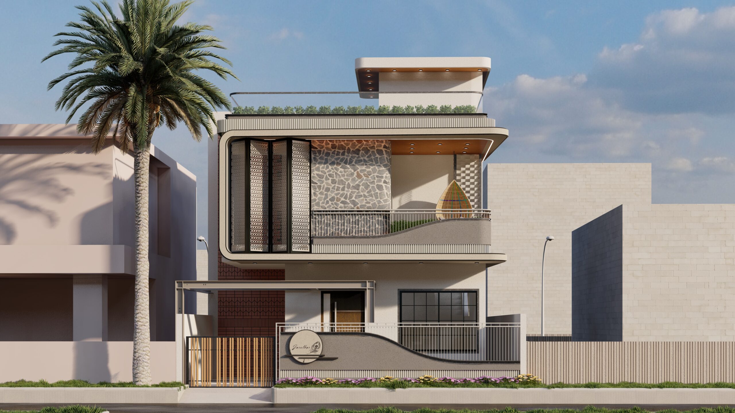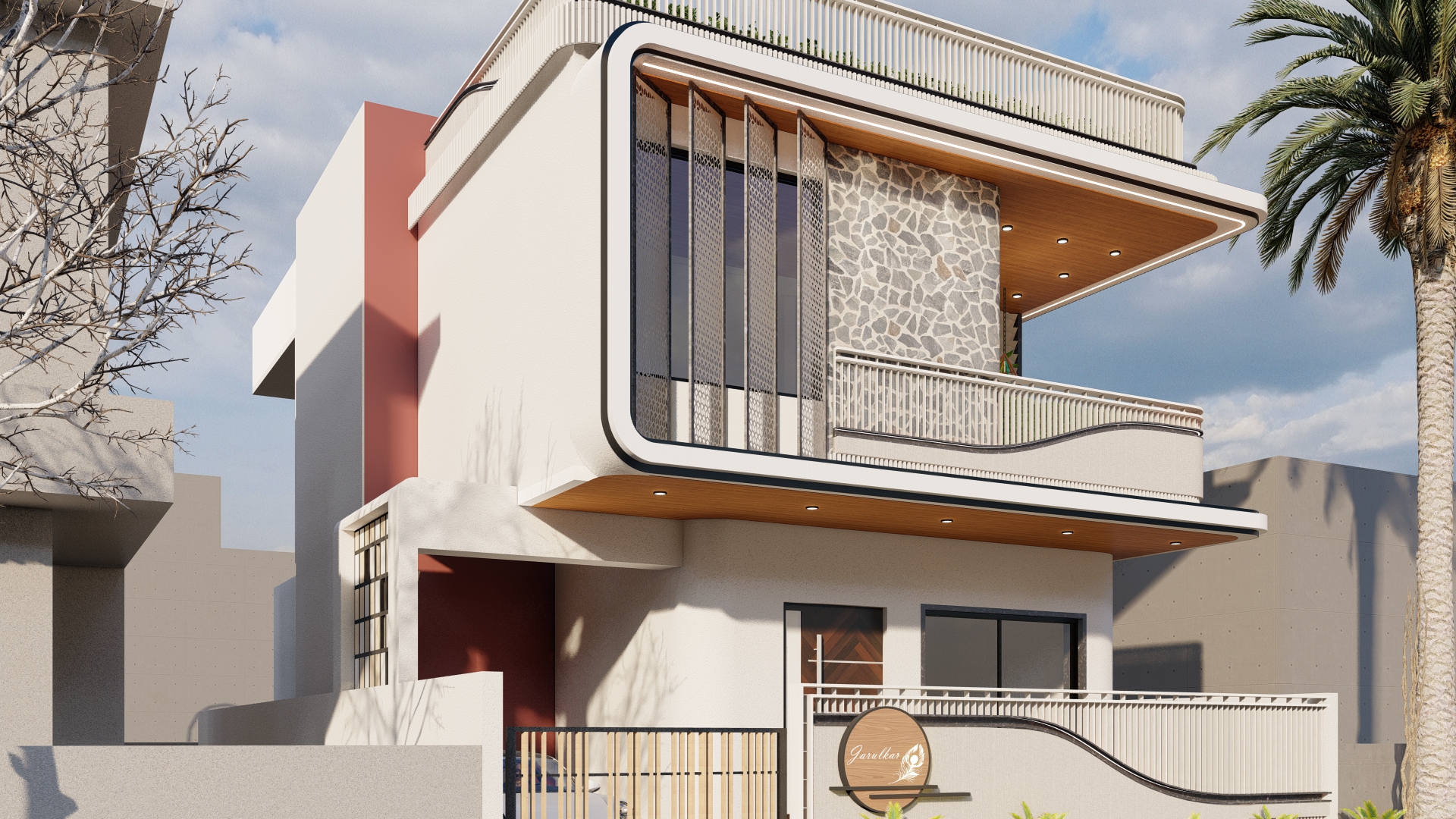This modern two-story residence showcases a minimalist yet elegant design, blending functionality with aesthetic appeal. The building’s facade emphasizes clean lines and geometric forms, combining curves and rectangular elements to create a dynamic visual flow. A primary focus is the interplay of materials: stone cladding adds a natural, grounded texture, while perforated metal screens provide a contemporary touch, offering both privacy and ventilation