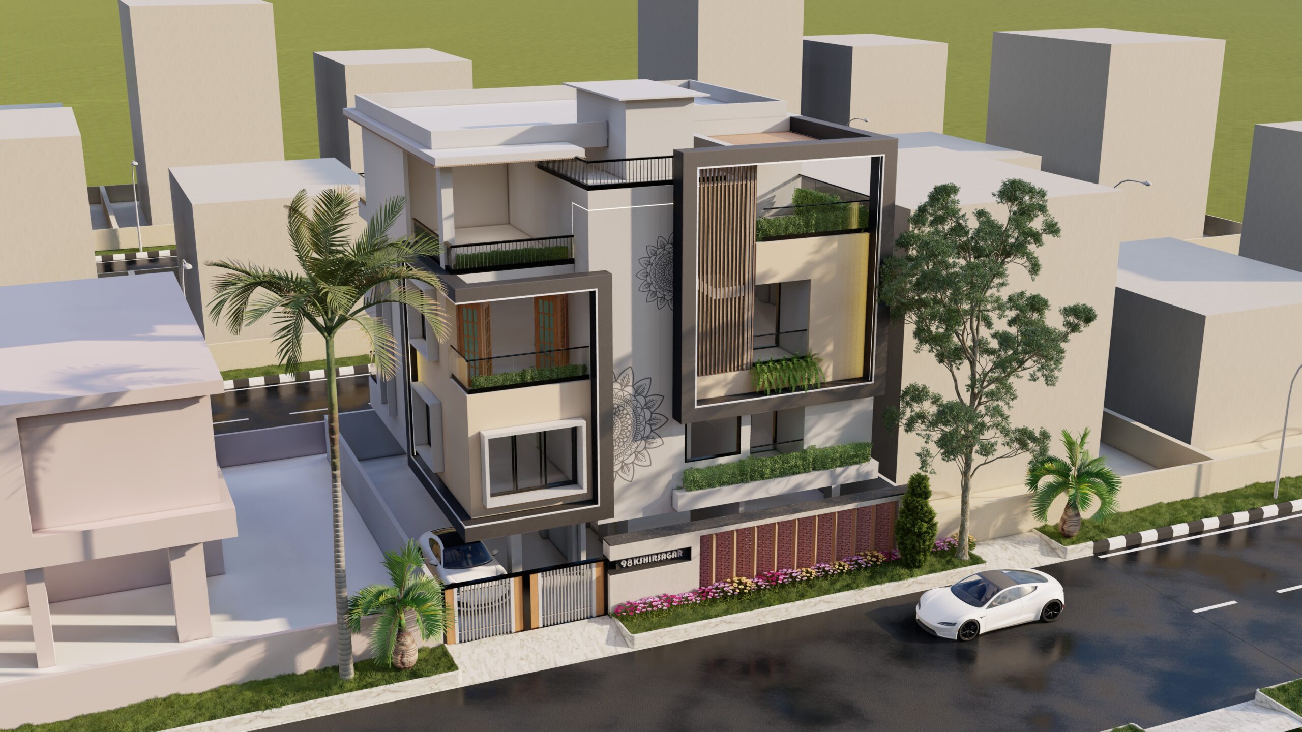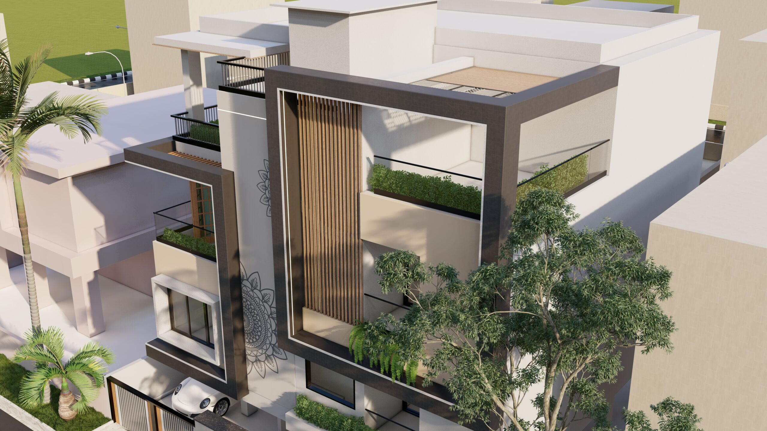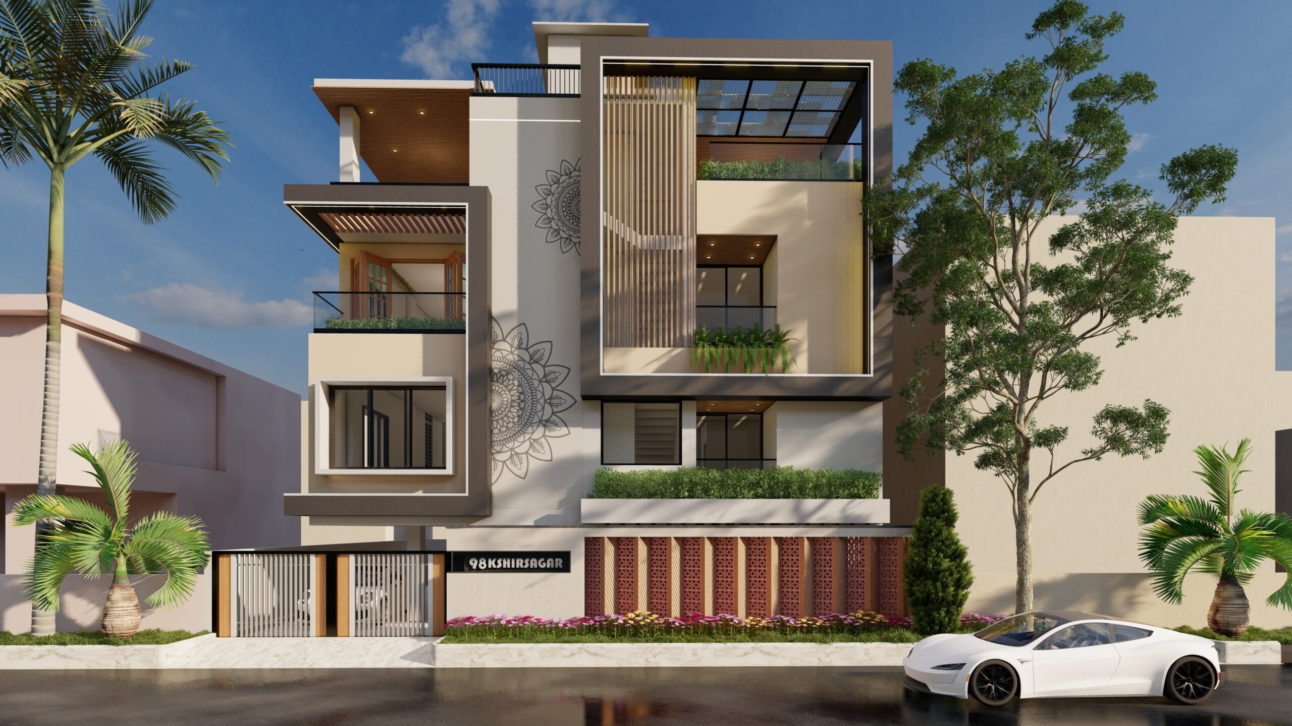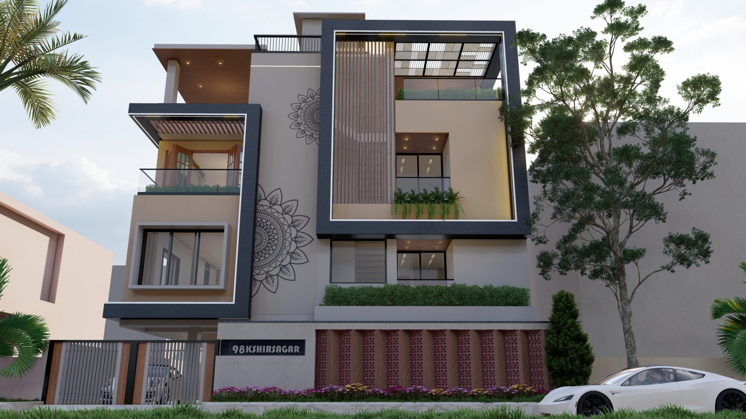 This building showcases a modern architectural design with a focus on clean lines, geometric frames, and layered facades. The use of terracotta jaali, vertical louvers, and perforated screens reflects a blend of traditional and contemporary aesthetics, ensuring privacy and natural ventilation. The material palette includes exposed concrete, terracotta, wood, and glass, emphasizing sustainability and elegance. The Mandala-inspired wall art adds a cultural touch, celebrating traditional motifs in a modern context. Functional zoning is evident, with large openings for natural light and spatial flow. This design is rooted in modernist and sustainable theories, prioritizing aesthetics, energy efficiency, and user comfort.