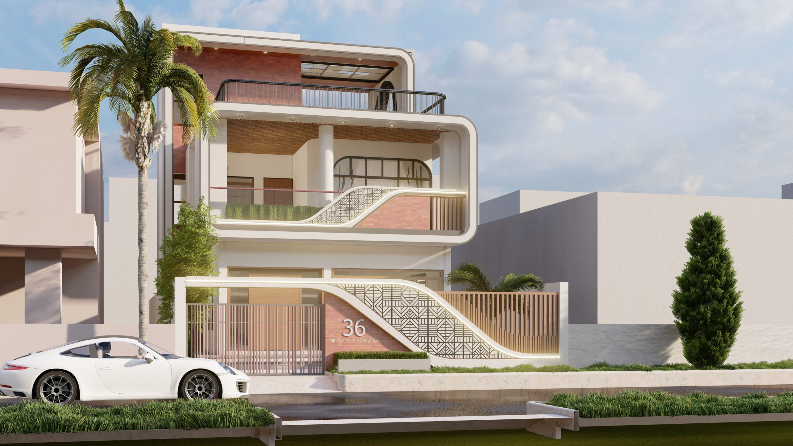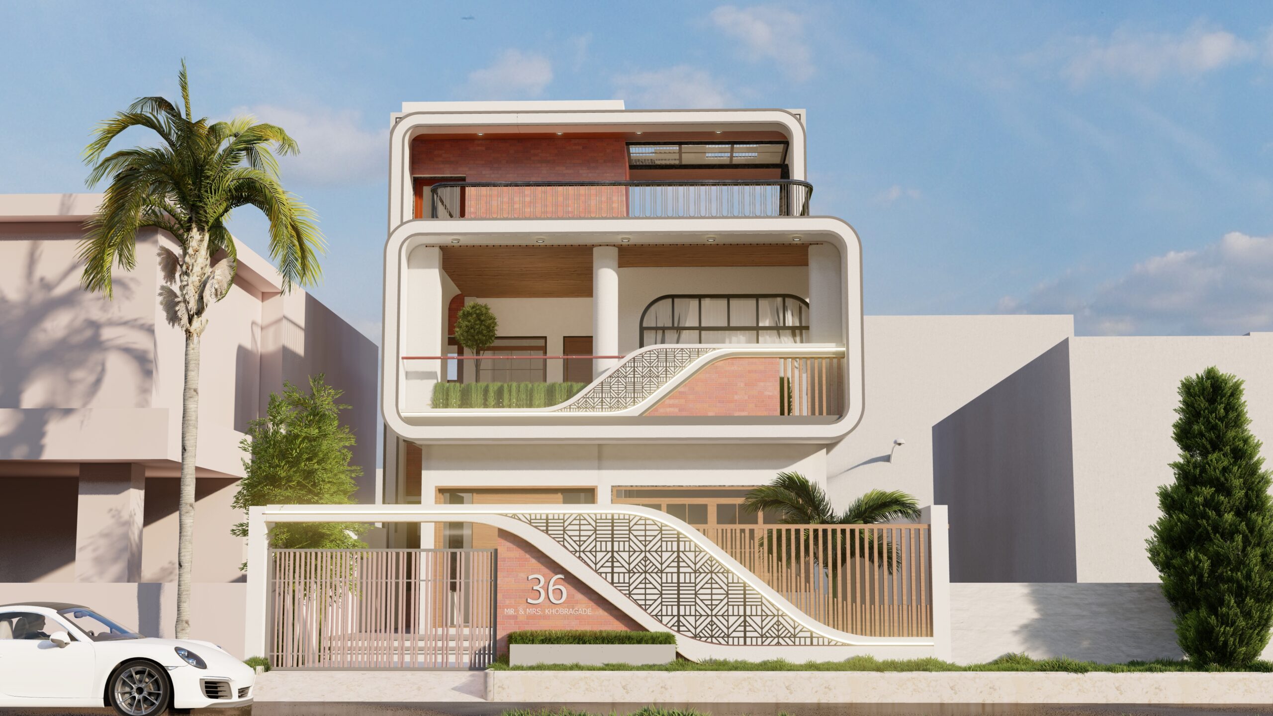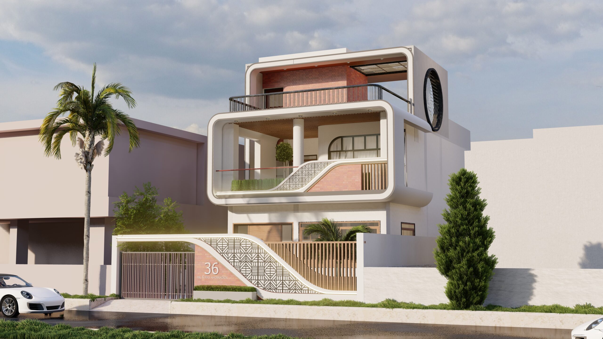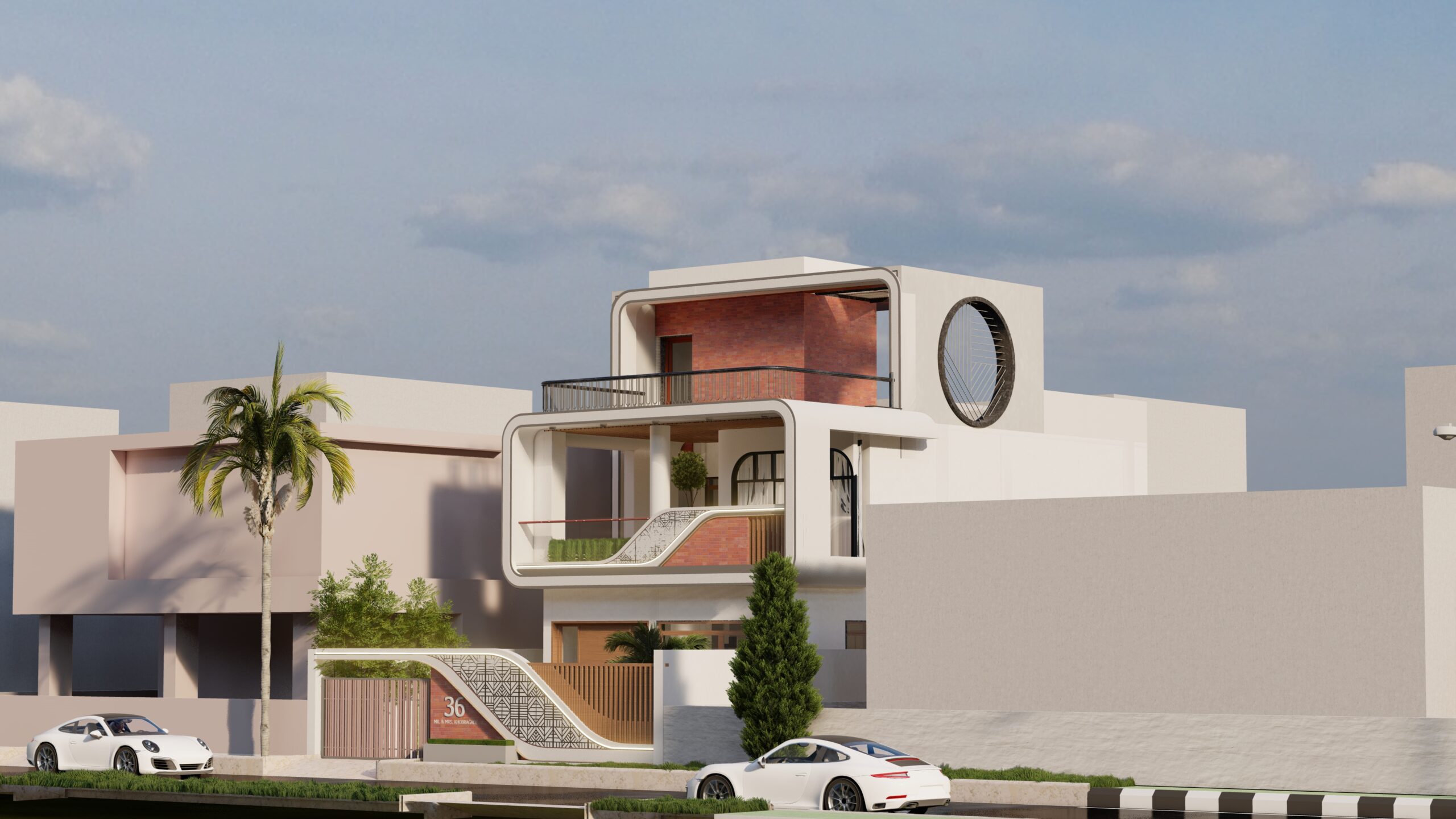 This contemporary residence is a harmonious blend of modern design and functional elegance. The design features bold geometric shapes, particularly the curved frames, which add a sense of fluidity and softness to the structure. The façade incorporates materials like exposed brick, white plaster, and glass, creating a dynamic interplay of textures and colors.