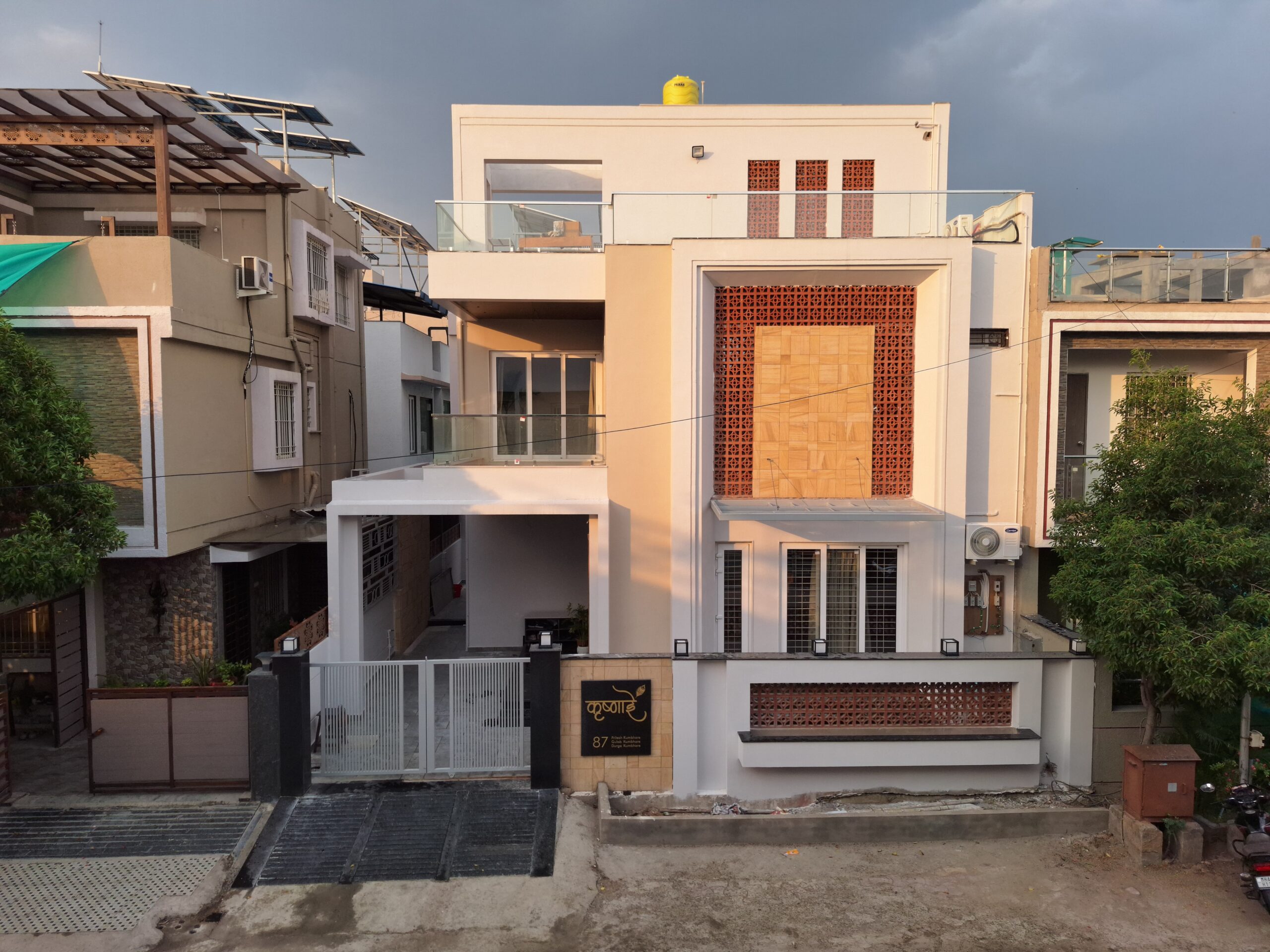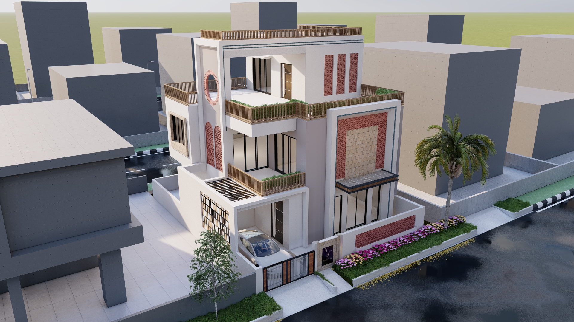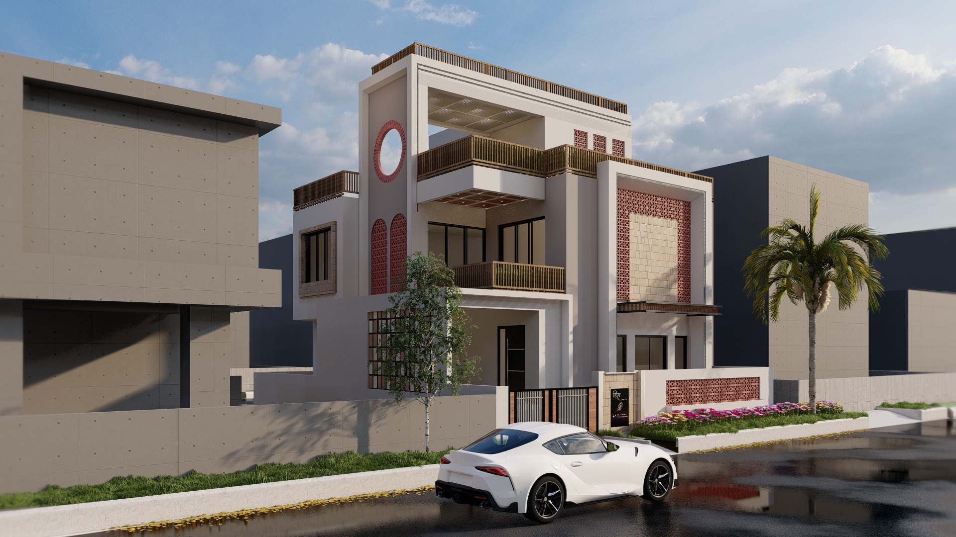 This building represents a harmonious blend of modern and traditional architectural principles, showcasing a contemporary facade enriched with traditional terracotta jaali work. The clean geometry emphasizes simplicity, while the framed composition adds depth and elegance to the structure. Key materials used include terracotta, natural stone, glass, and concrete, combining durability with aesthetic appeal.