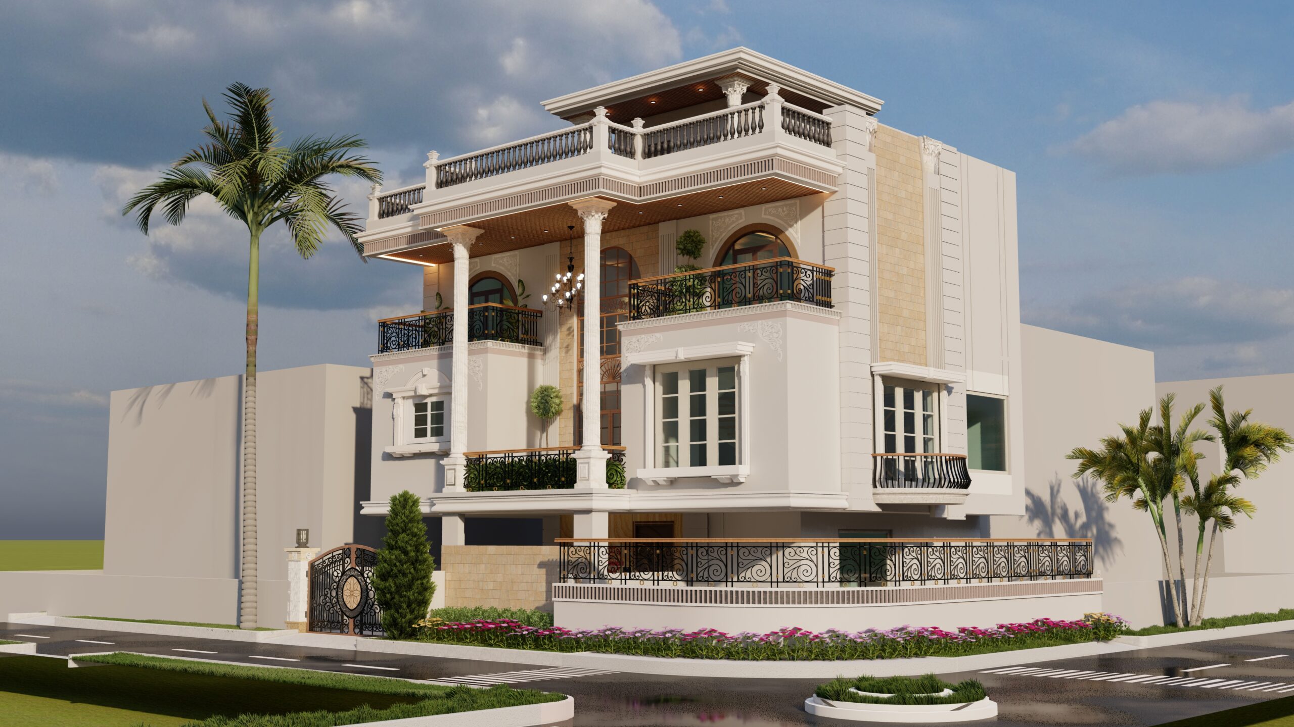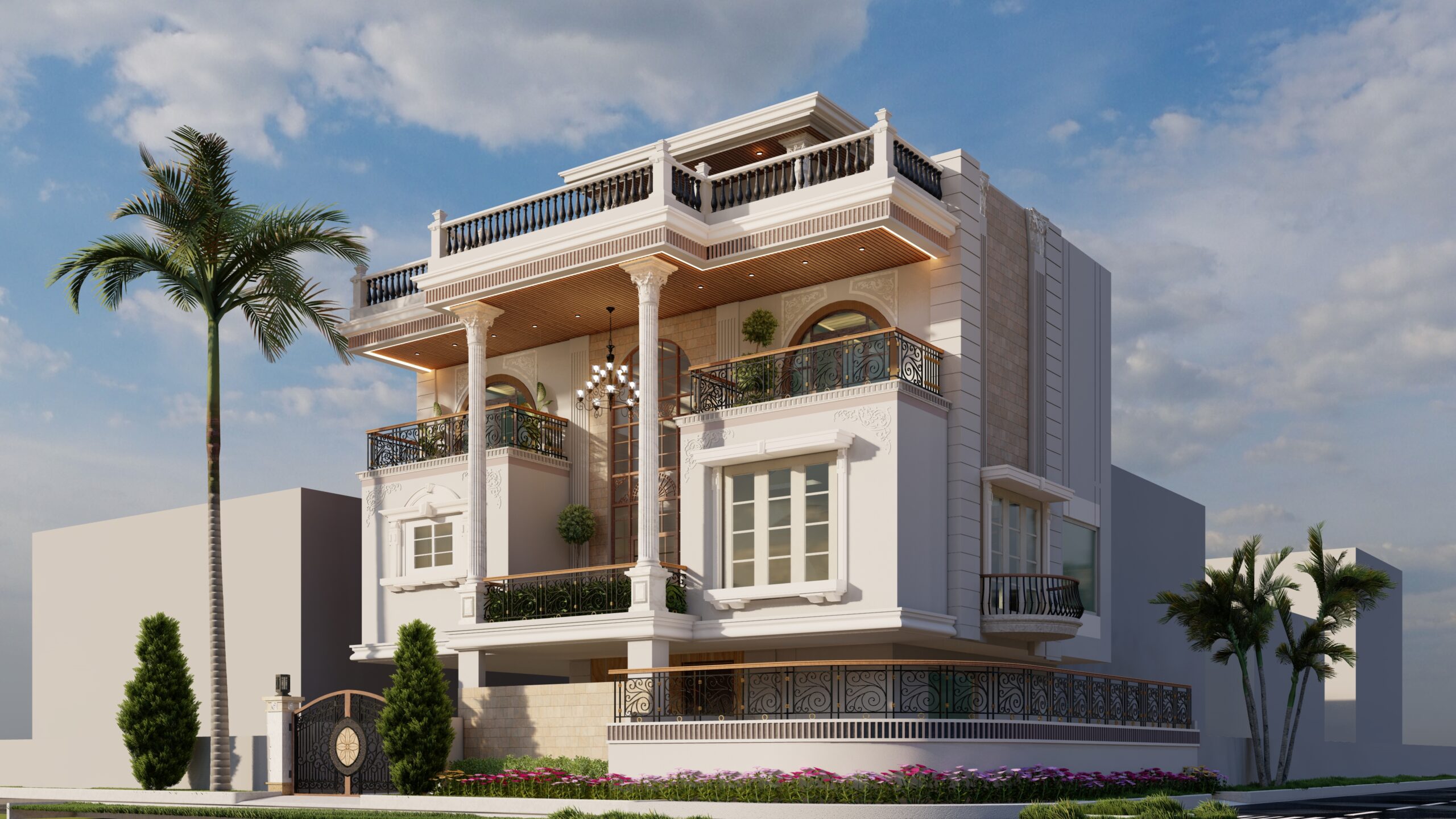 This building exudes a classic yet contemporary architectural style with a focus on symmetry, grandeur, and attention to detail. The façade integrates elements of neoclassical design, highlighted by tall decorative columns, intricate moldings, and arched windows, which give the structure an elegant and timeless appearance. The addition of wrought iron railings on the balconies adds an ornate and sophisticated touch.