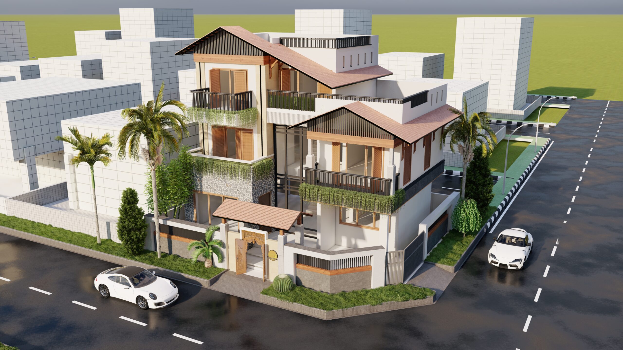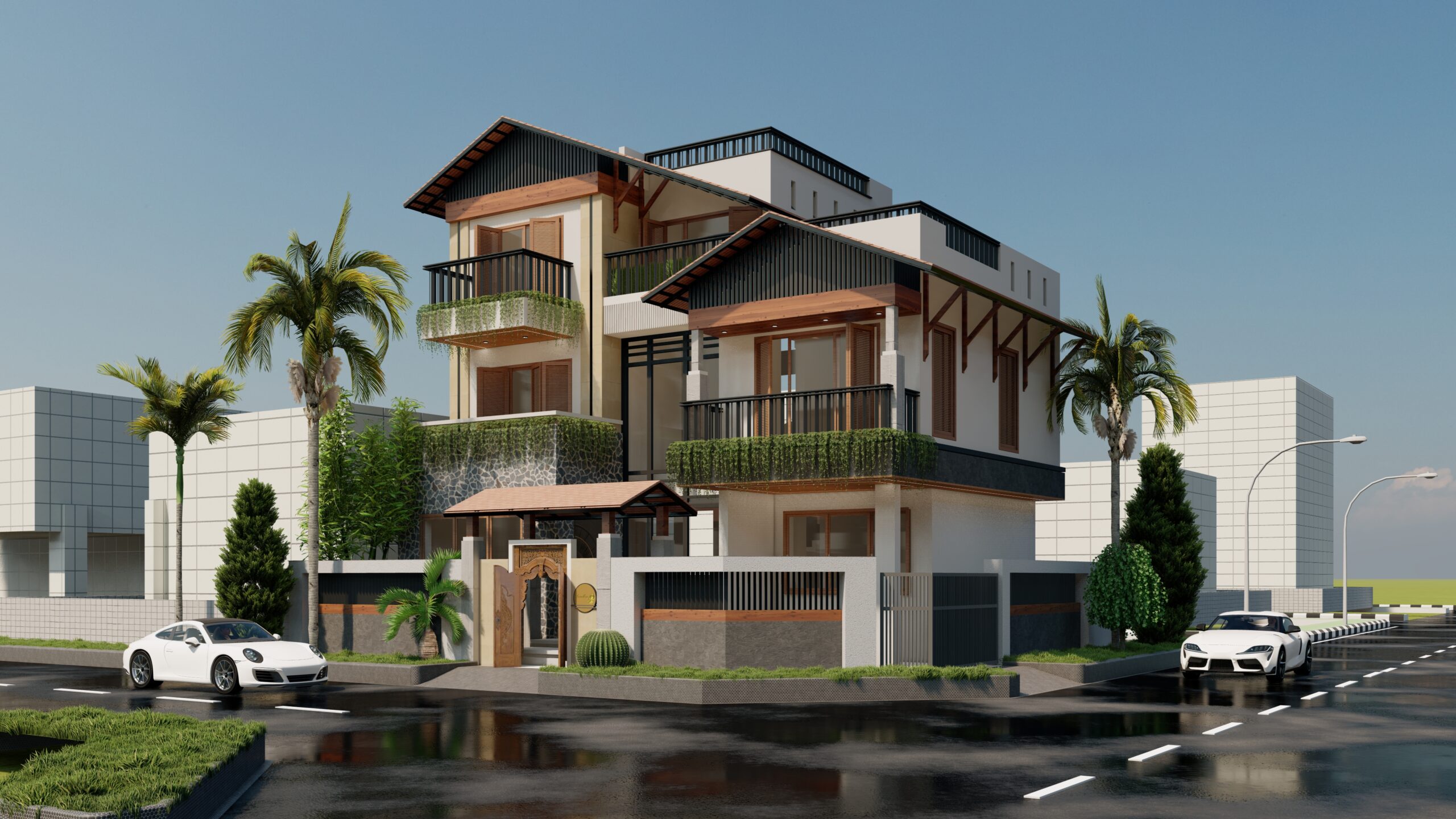This residence integrates traditional and modern design elements, creating a cohesive aesthetic that emphasizes functionality and elegance. The pitched roof, wooden brackets, and overhangs reflect a vernacular architectural influence, ensuring harmony with the local climate by offering protection from rain and sun. Vertical greenery on balconies adds biophilic charm, enhancing environmental sustainability and improving indoor air quality.