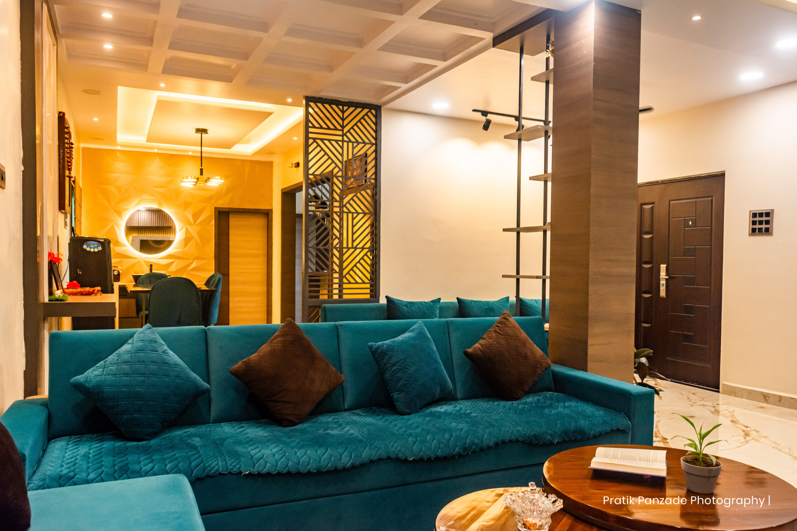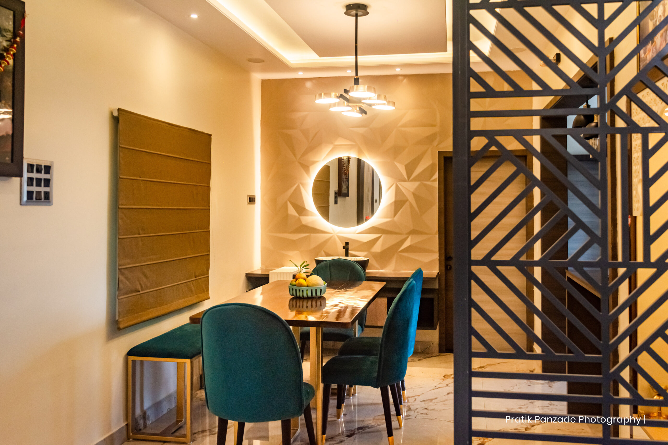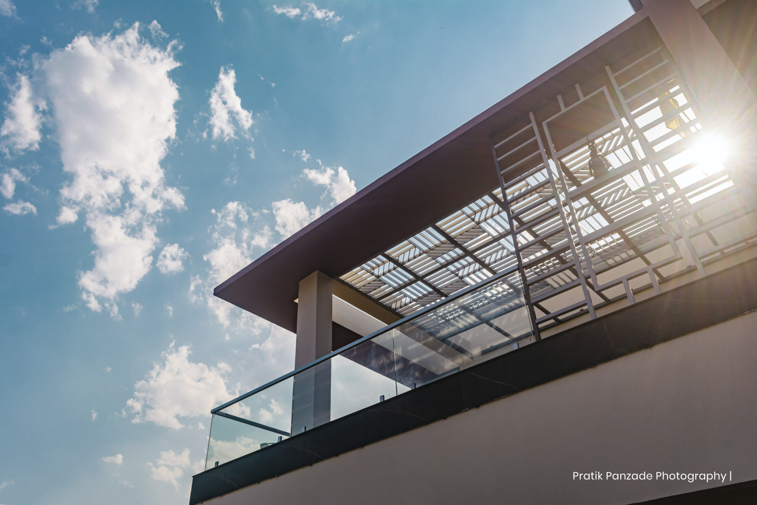 This modern residential design emphasizes simplicity and functionality, integrating contemporary architectural principles. The structure features clean lines, angular forms, and a balanced asymmetry. The perforated metal screens on the façade add a layer of privacy, while allowing natural ventilation and diffused light to enter the space. The material palette includes glass railings, perforated metal, concrete, and muted tones of paint, reflecting a minimalist aesthetic. The semi-open terrace with a metal pergola provides an outdoor living area that enhances spatial usability.