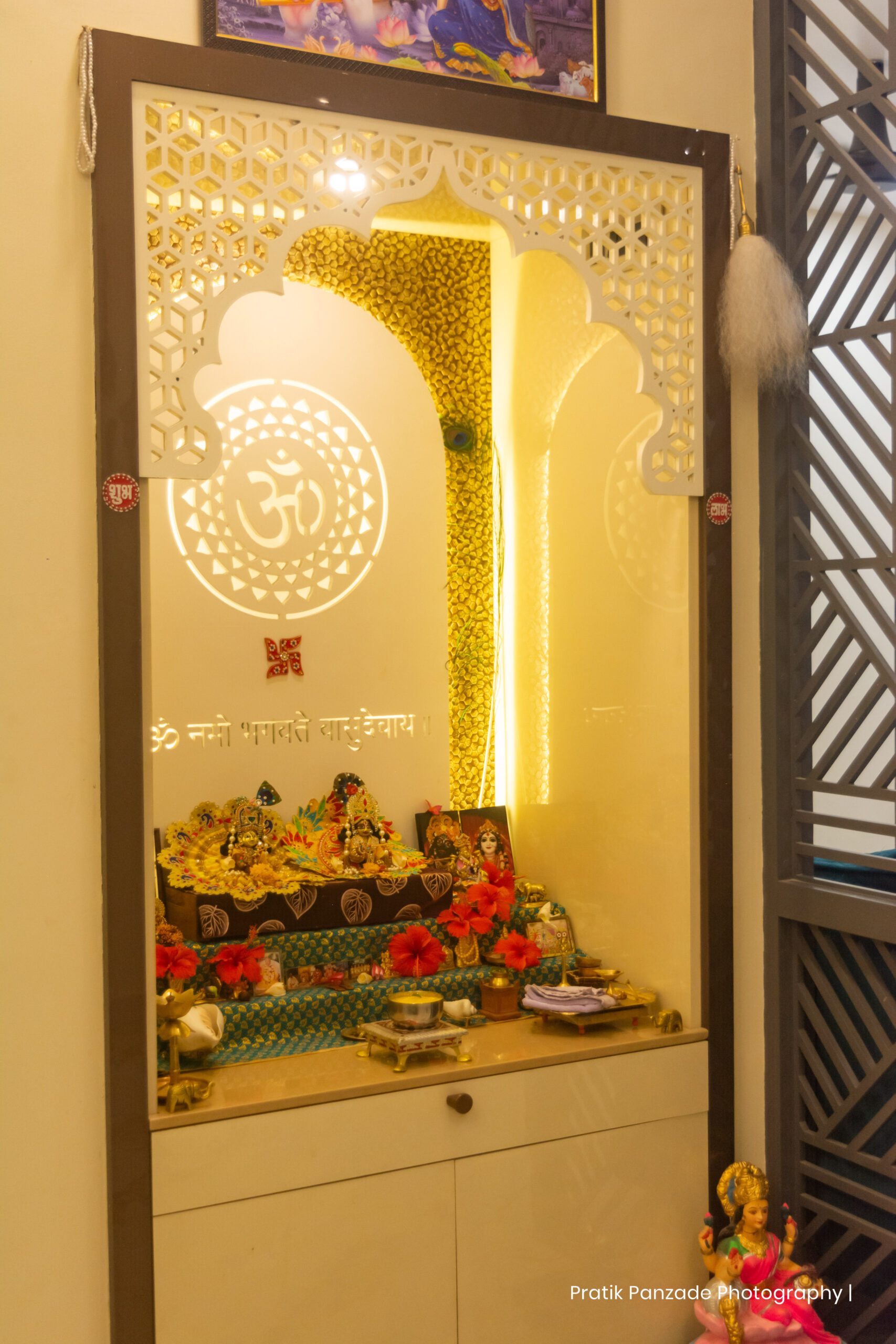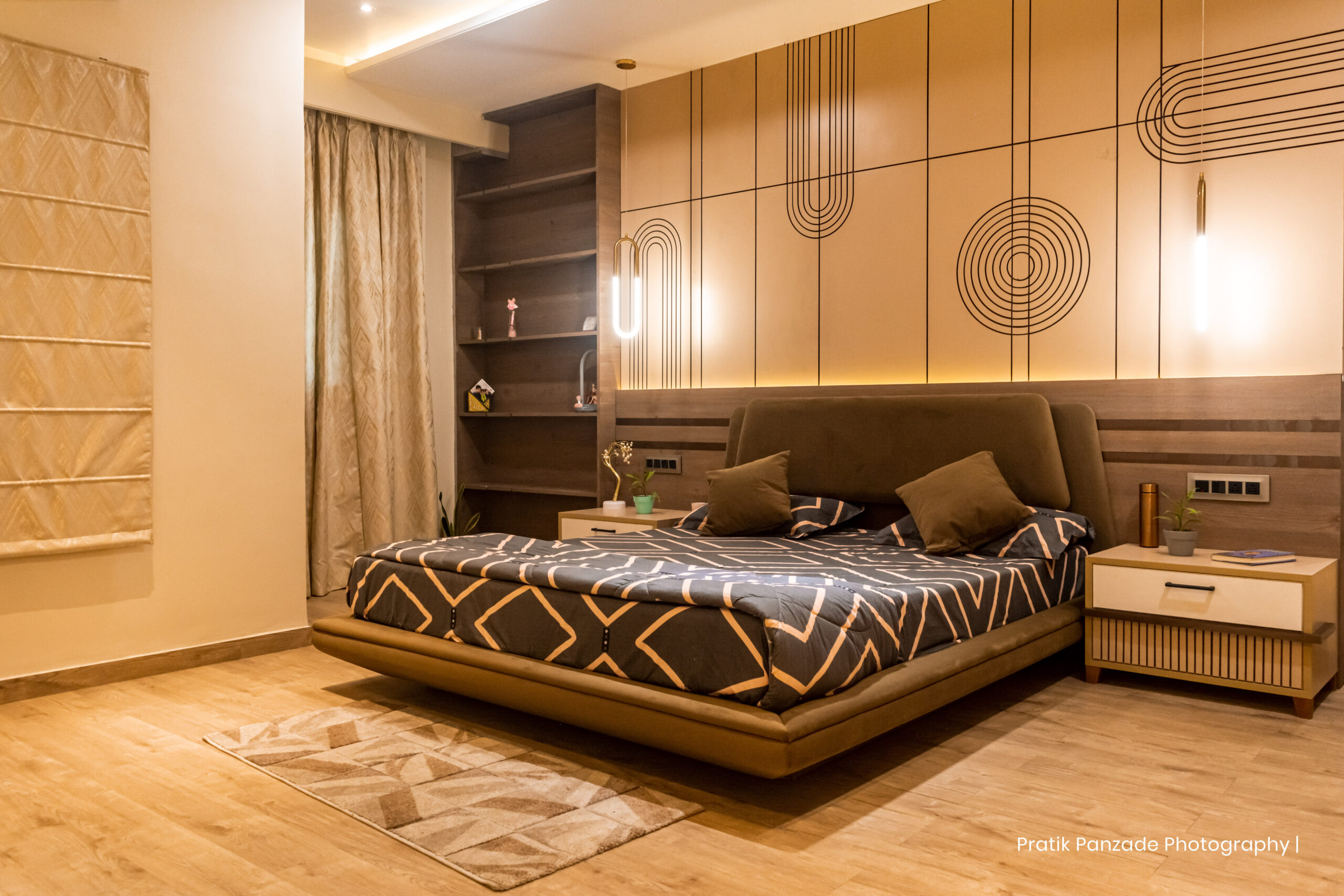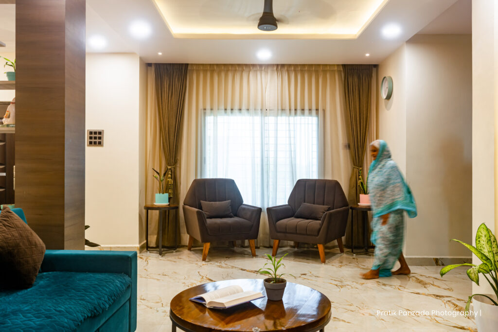 This modern residential design emphasizes simplicity and functionality, integrating contemporary architectural principles. The structure features clean lines, angular forms, and a balanced asymmetry. The perforated metal screens on the façade add a layer of privacy, while allowing natural ventilation and diffused light to enter the space. The material palette includes glass railings, perforated metal, concrete, and muted tones of paint, reflecting a minimalist aesthetic. The semi-open terrace with a metal pergola provides an outdoor living area that enhances spatial usability.