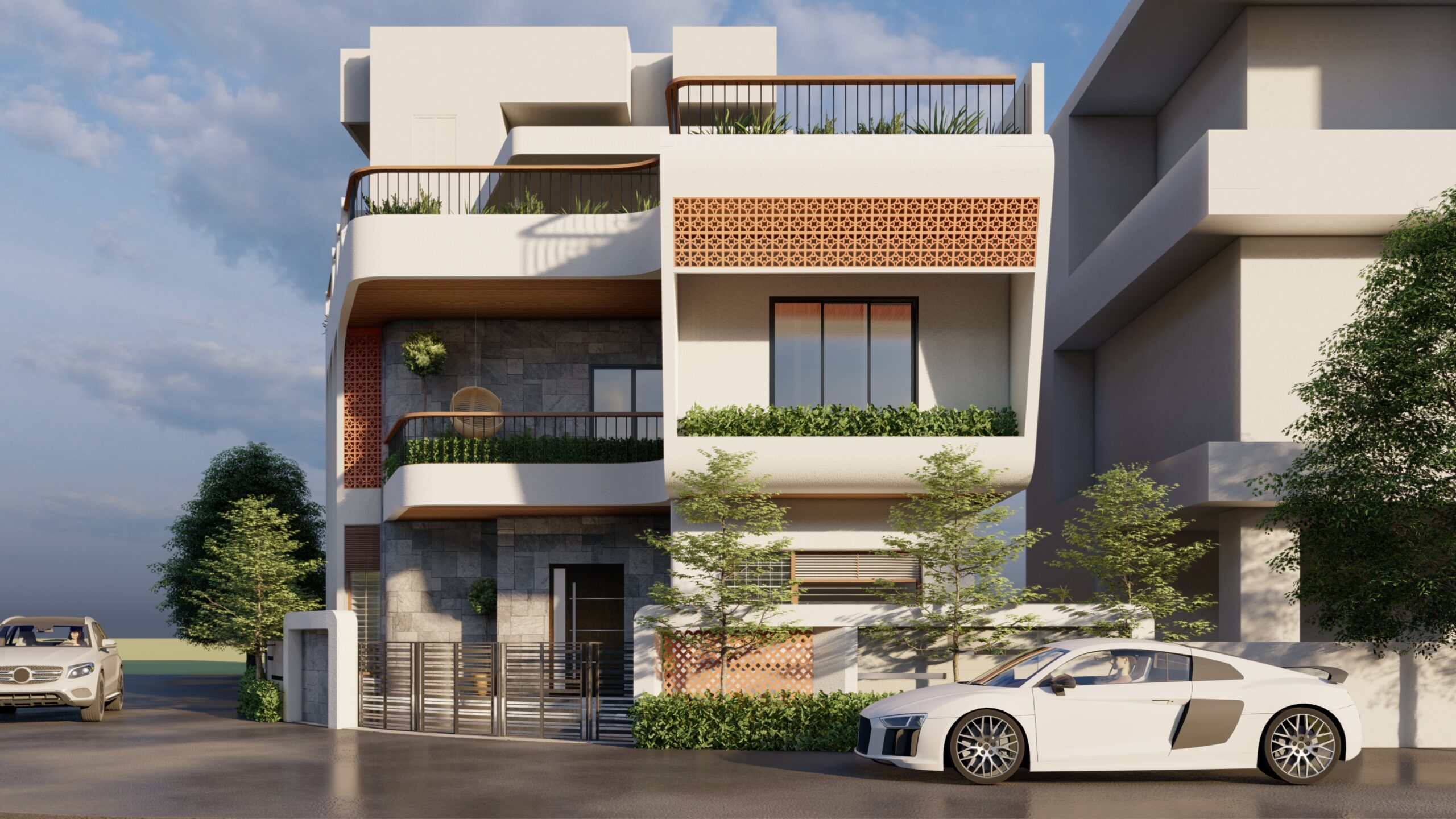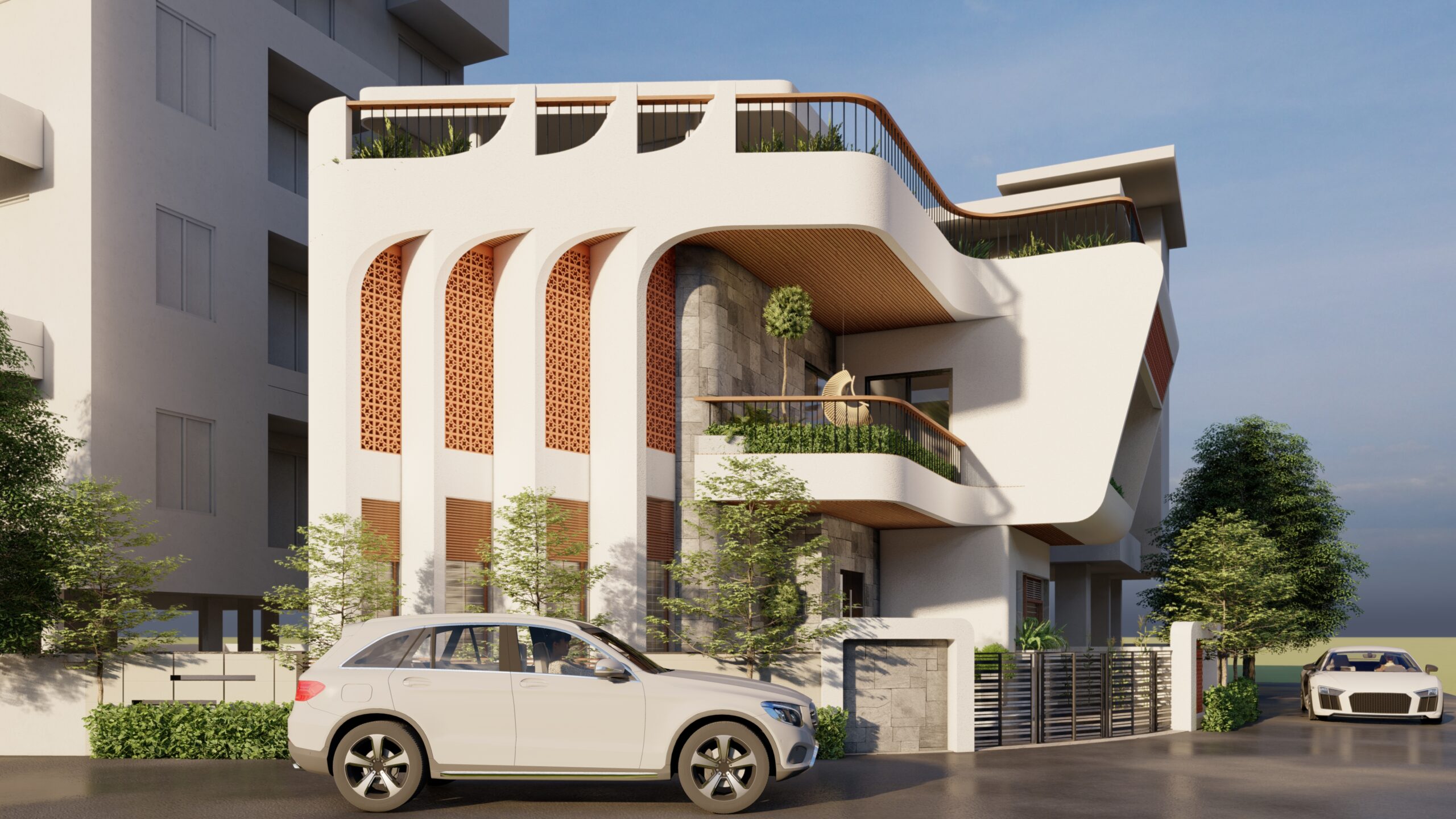 The design uses clean lines, sharp angles, and curved balconies and walls to create a dynamic and visually engaging form. Balconies feature sleek, dark metal railings. The use of vertical and horizontal lines creates a sense of balance while the curved elements soften the overall aesthetic, preventing it from feeling overly rigid. The landscaping consisting of neatly trimmed hedges and small trees adds to the building’s modern and sophisticated ambiance. Materials appear high-quality and lend to a luxurious look. The design theory employed seems to focus on creating a visually striking and functional space by integrating both simplicity and decorative elements, aiming for a balance between modern minimalist principles and subtle cultural references possibly derived from regional architectural traditions in the choice of brickwork. The overall impression is one of elegance, sophistication, and functionality.