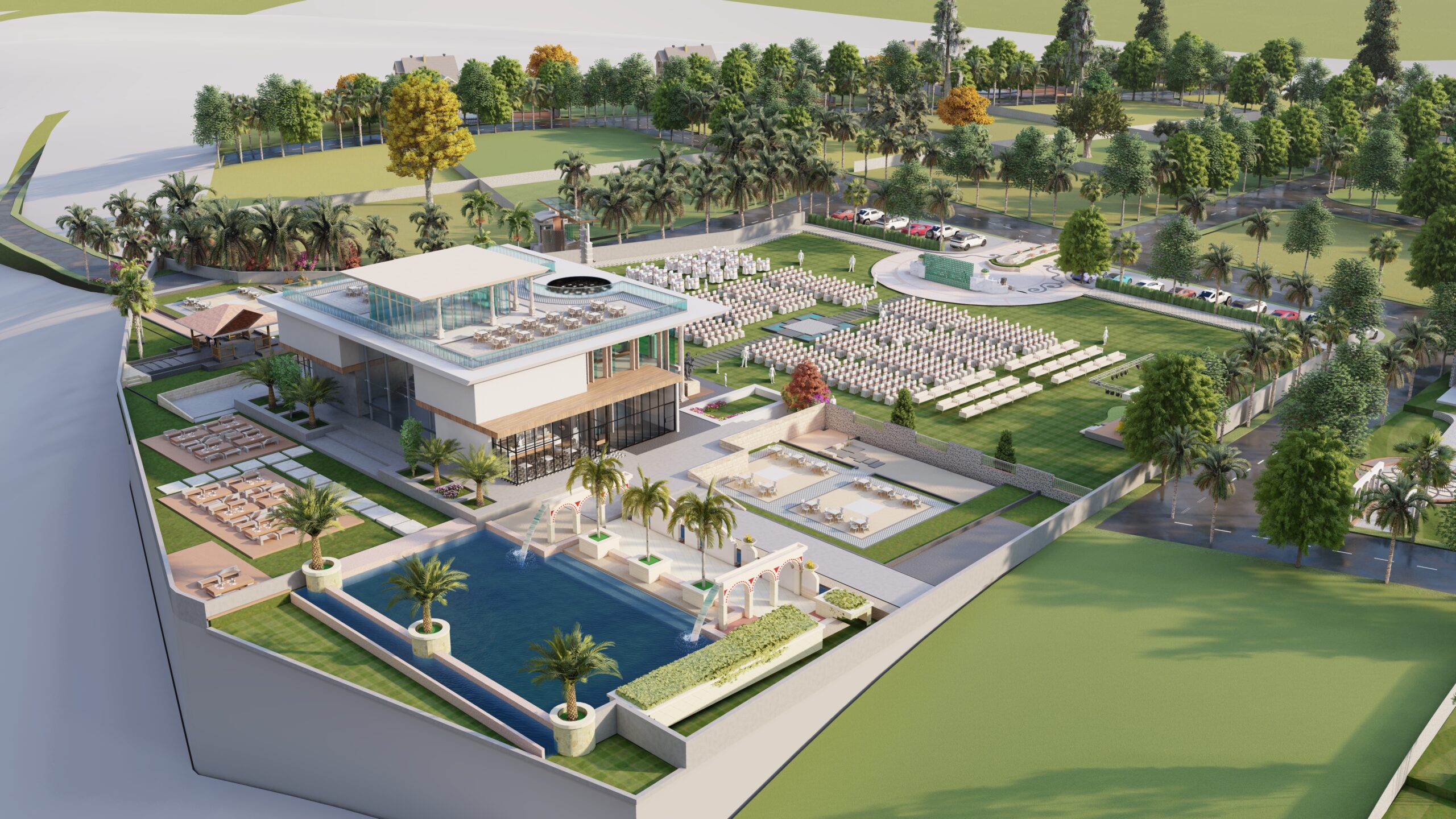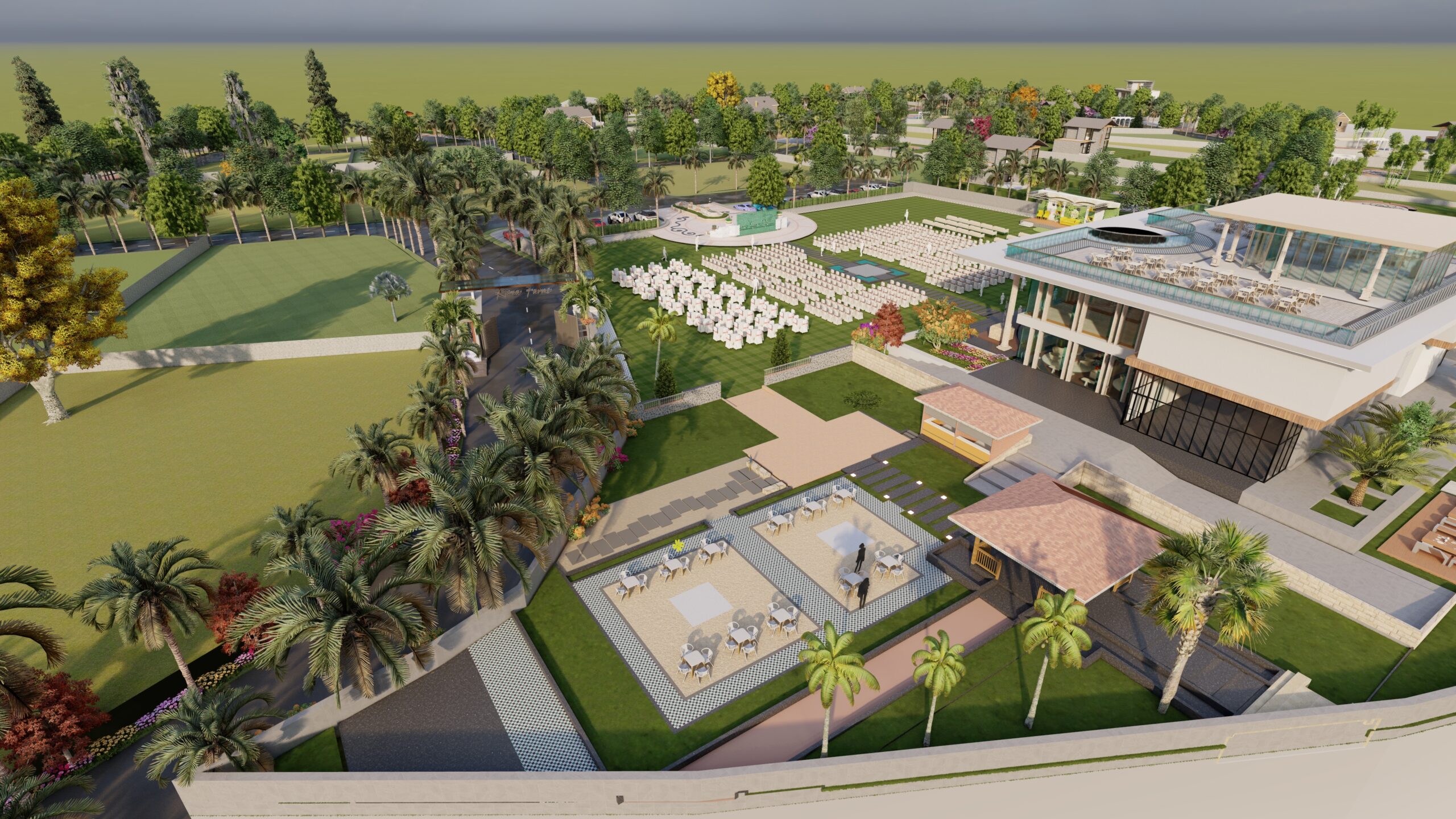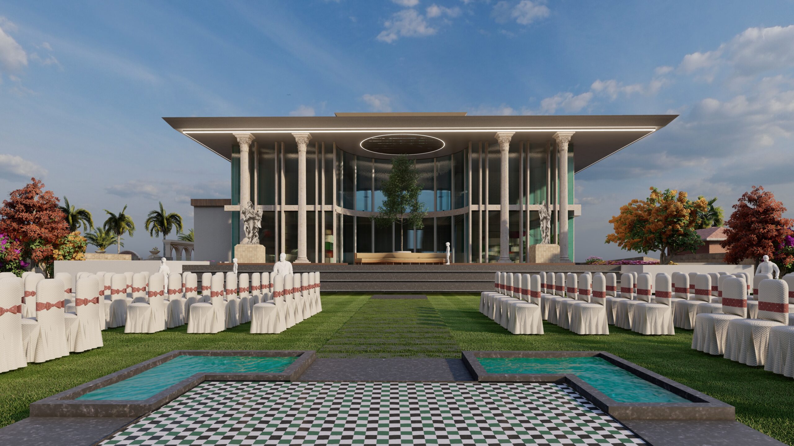 This grand structure, designed by me, is an embodiment of neoclassical symmetry fused with modernism. The elevation emphasizes verticality and rhythm through tall, slender columns and extensive use of glass, promoting transparency and openness. The central water fountain and patterned stonework in the forecourt enhance the axial approach, leading the eye towards the formal entrance. Materials include polished stone, structural glass, and steel, ensuring durability and elegance. Rooted in principles of monumentalism and formality, the design creates a balanced dialogue between built and unbuilt spaces. The landscaped foreground and rooftop elements reinforce visual hierarchy and climatic responsiveness.