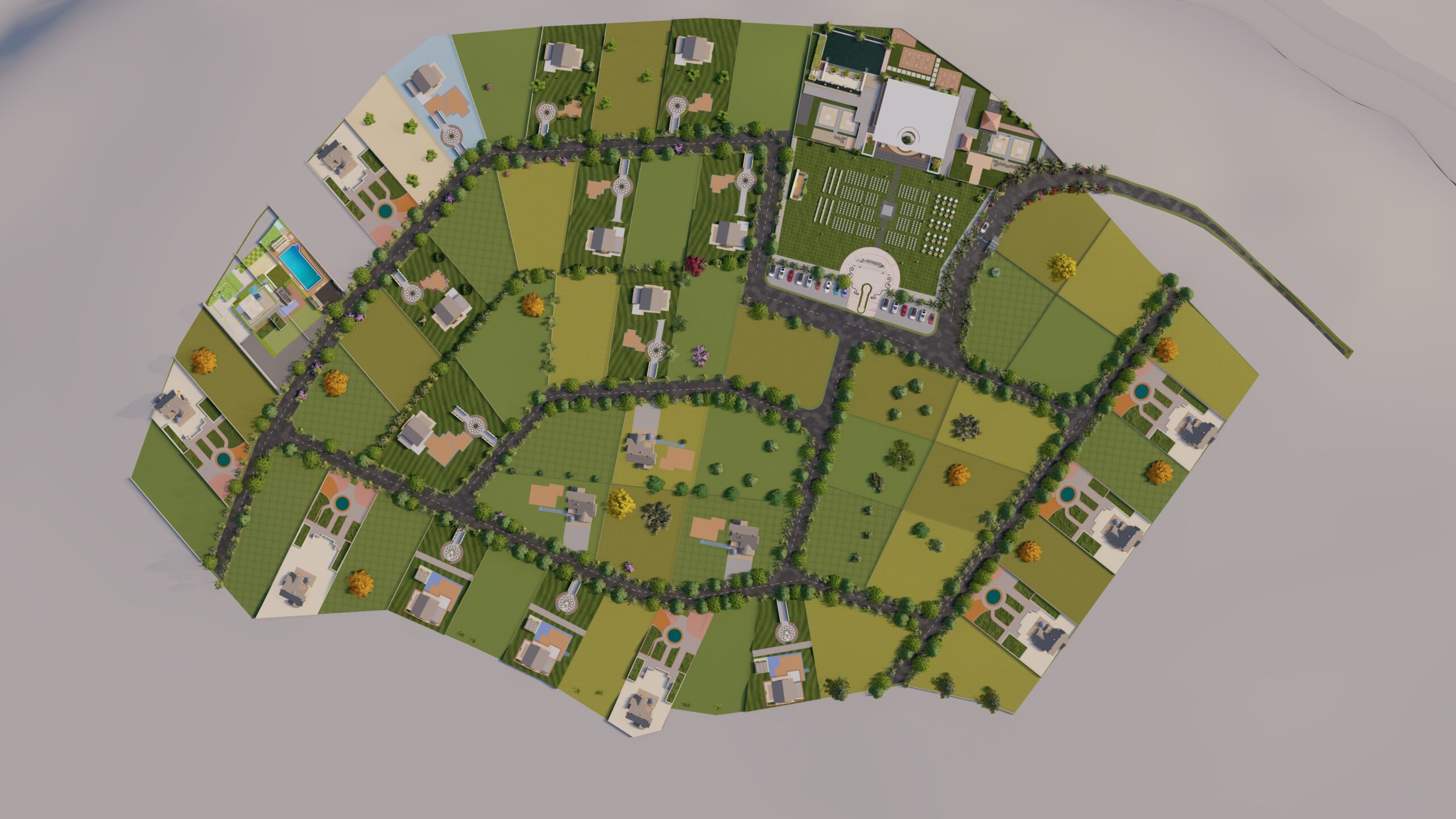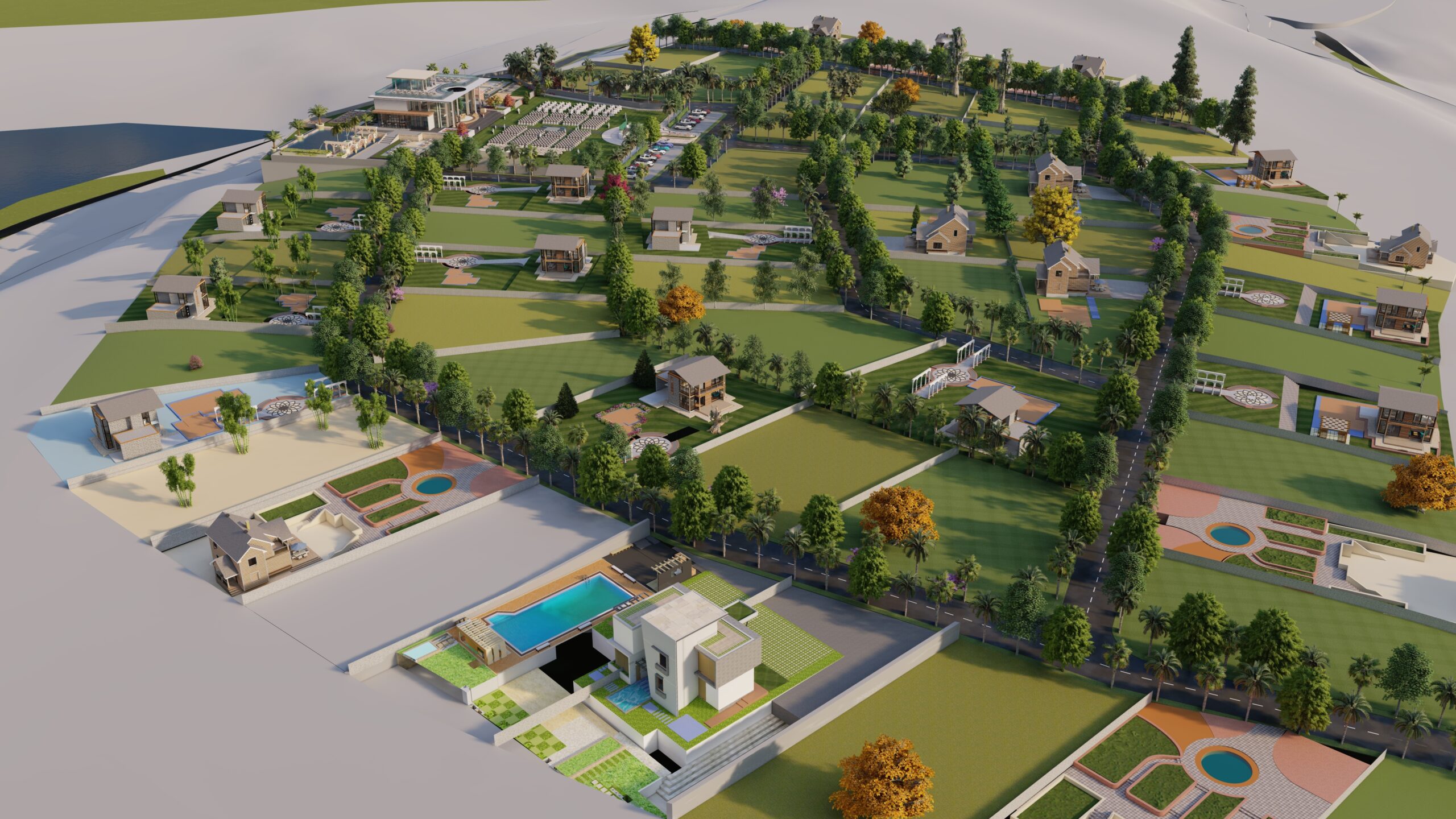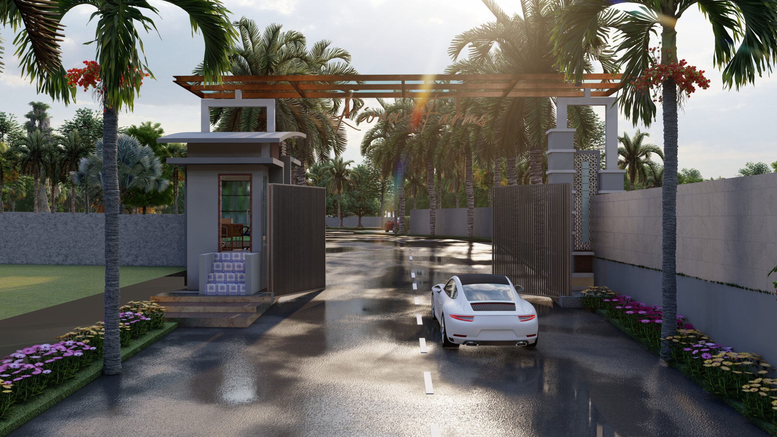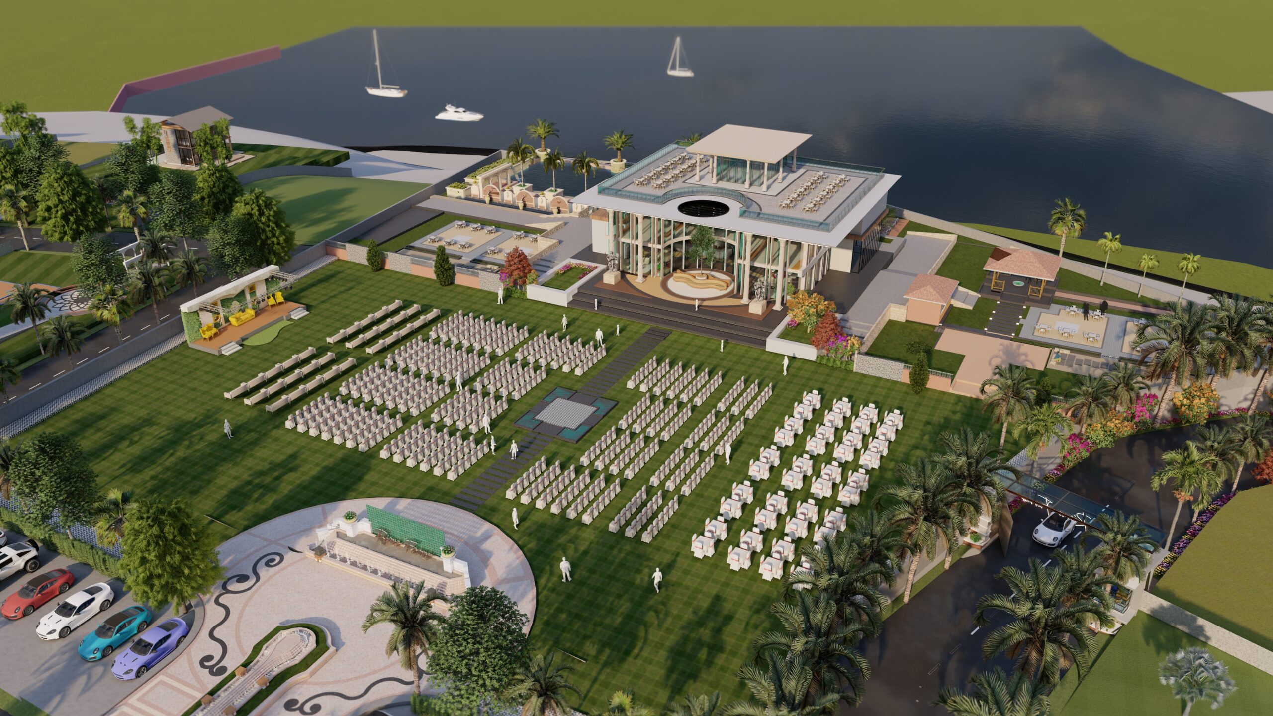 This grand structure, designed by me, is an embodiment of neoclassical symmetry fused with modernism. The elevation emphasizes verticality and rhythm through tall, slender columns and extensive use of glass, promoting transparency and openness. The central water fountain and patterned stonework in the forecourt enhance the axial approach, leading the eye towards the formal entrance. Materials include polished stone, structural glass, and steel, ensuring durability and elegance. Rooted in principles of monumentalism and formality, the design creates a balanced dialogue between built and unbuilt spaces. The landscaped foreground and rooftop elements reinforce visual hierarchy and climatic responsiveness.