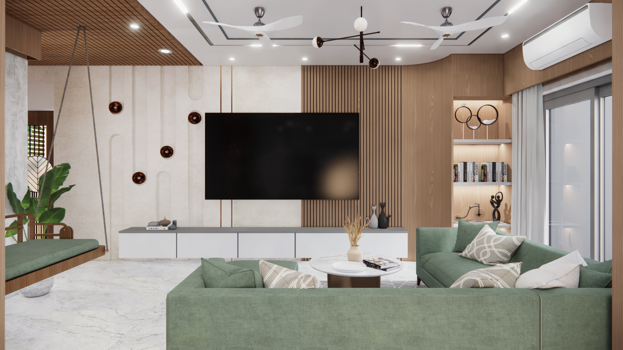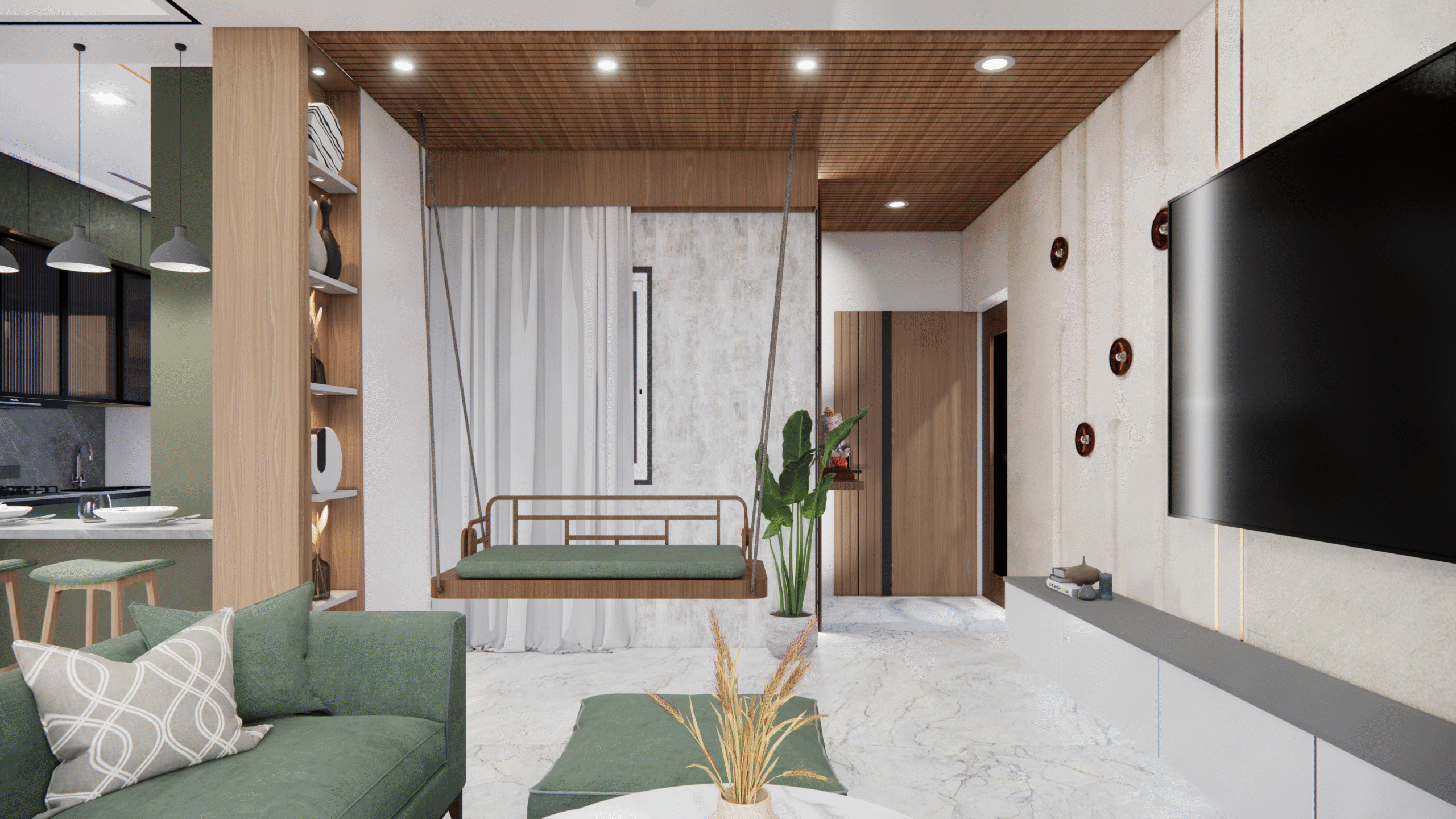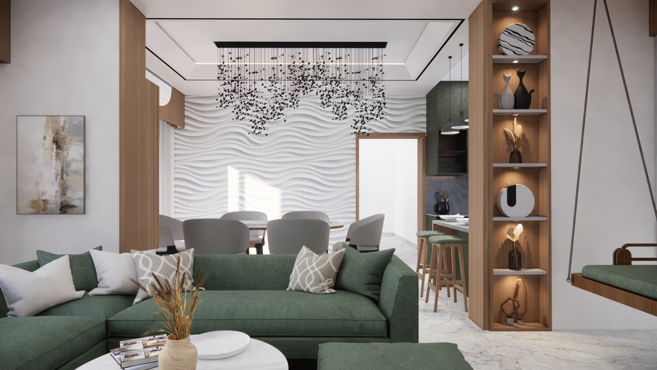 This living-dining area was designed to create a modern, functional, and visually balanced environment using a muted earthy palette and clean lines. I used a combination of veneered wood panels, 3D ripple wall textures, and layered ceiling lighting to add depth and dimension. The olive green upholstered seating contrasts harmoniously with the neutral marble flooring and sculptural decor elements. A floating swing and open shelf with ambient lights add warmth and character. The space follows open-plan zoning and contemporary minimalism, ensuring fluidity between the lounge and dining. Large windows and glass sliders bring in ample daylight, enhancing spatial openness and user comfort.