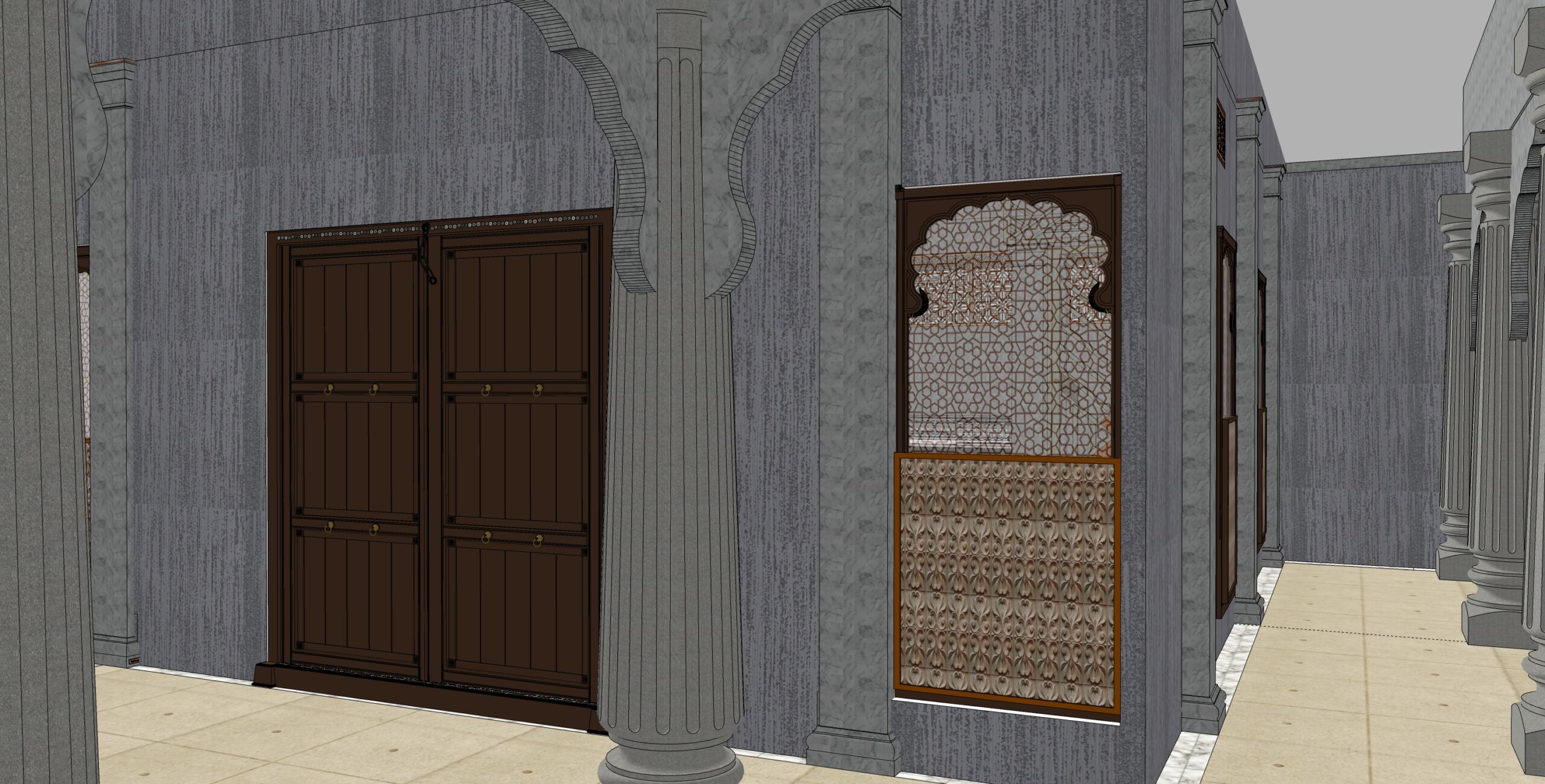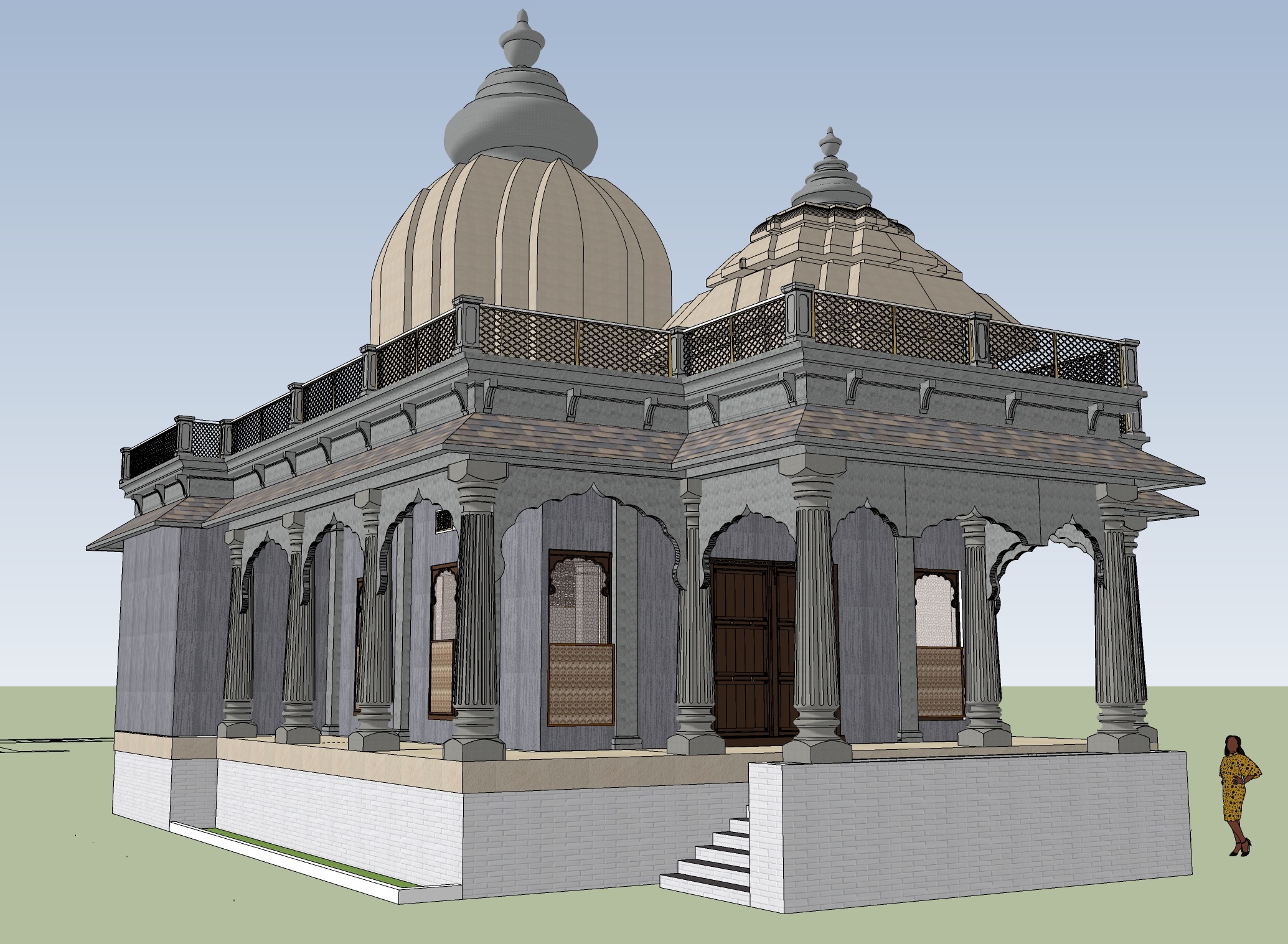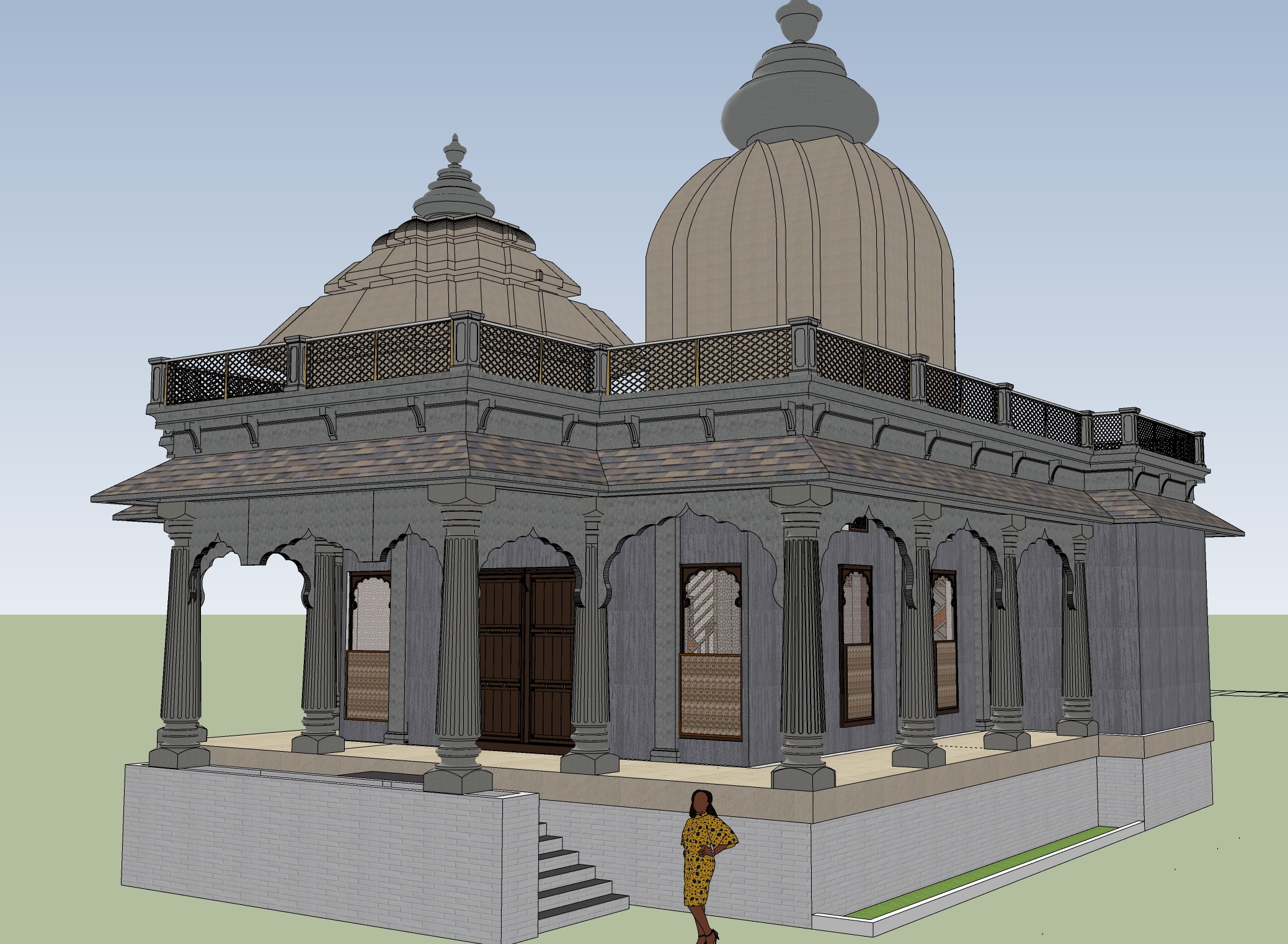 This temple design reflects a harmonious blend of traditional Indian temple architecture and contemporary material application. I drew inspiration from Nagara-style architecture, evident in the curvilinear Shikhara and intricately carved Mandapa. Locally-sourced sandstone textures, granite-like columns, and white-washed platforms were used to retain cultural essence while ensuring durability. The symmetrical layout, axial entry, and elevated plinth enhance the temple’s spiritual and architectural prominence. I applied Vastu principles for orientation and energy flow. The jaali railings, domes, and stepped access embody the sanctity of sacred spaces, creating a devotional environment rooted in timeless design philosophies with a modern structural approach.